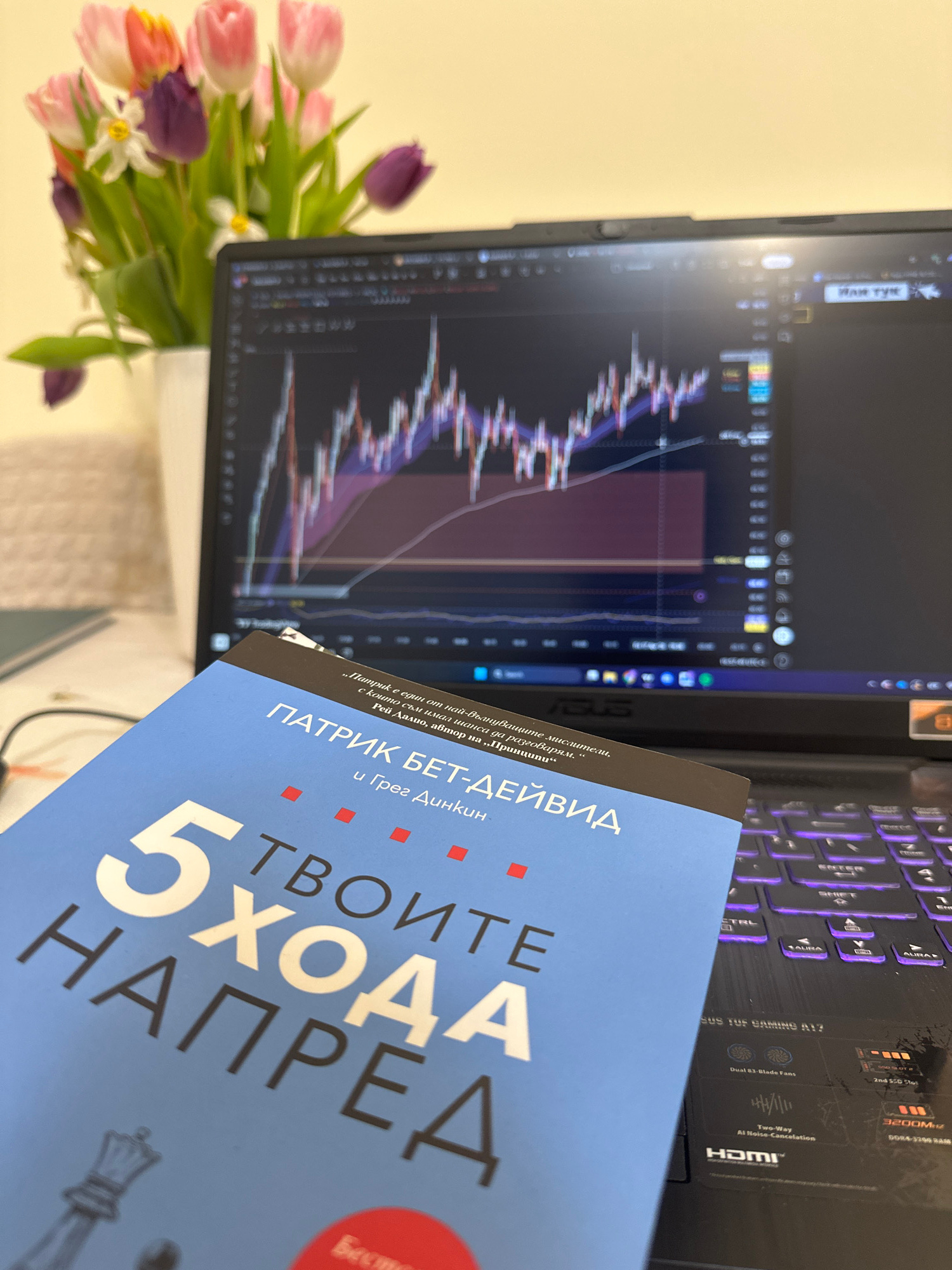 Here's a detailed description of the image: **Subjects and Objects:** * A laptop with a chart displayed on the screen (likely a financial chart indicating stock prices or trading data). * A book…read more