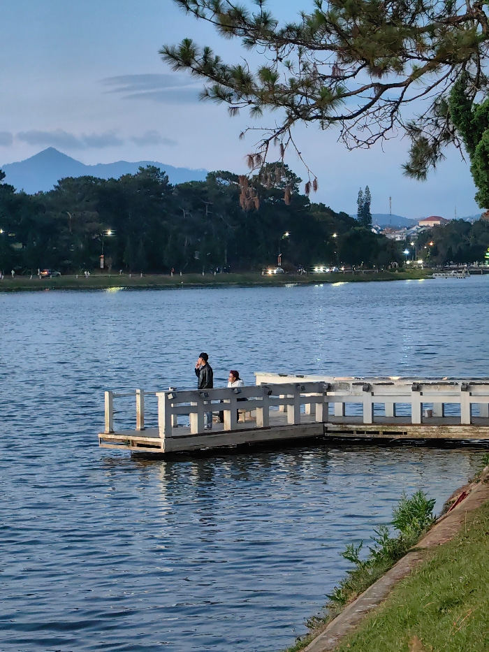 The image depicts Xuan Huong Lake in Da Lat, Vietnam, during twilight hours. In the foreground, the lower right shows a grassy bank with a concrete edge bordering the lake. Overhanging branches of a p…read more