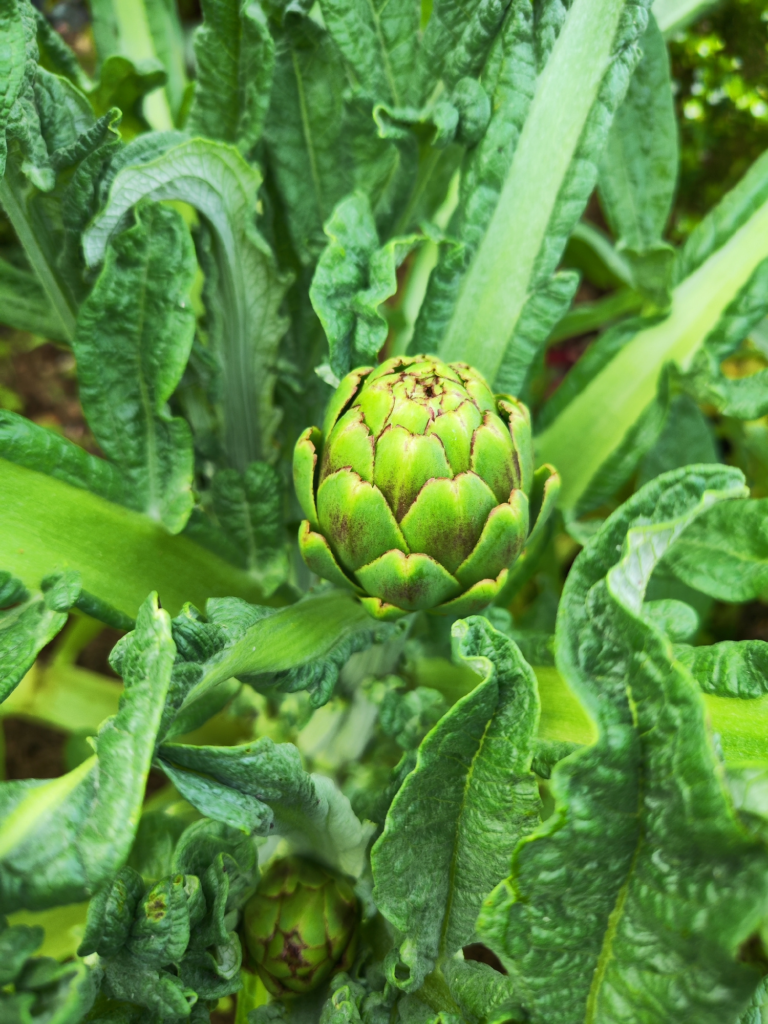 The image shows an artichoke plant in Ribeira Grande, Portugal. A prominent, immature artichoke bud is centrally positioned, surrounded by large, vibrant green leaves with textured surfaces. A smaller…read more