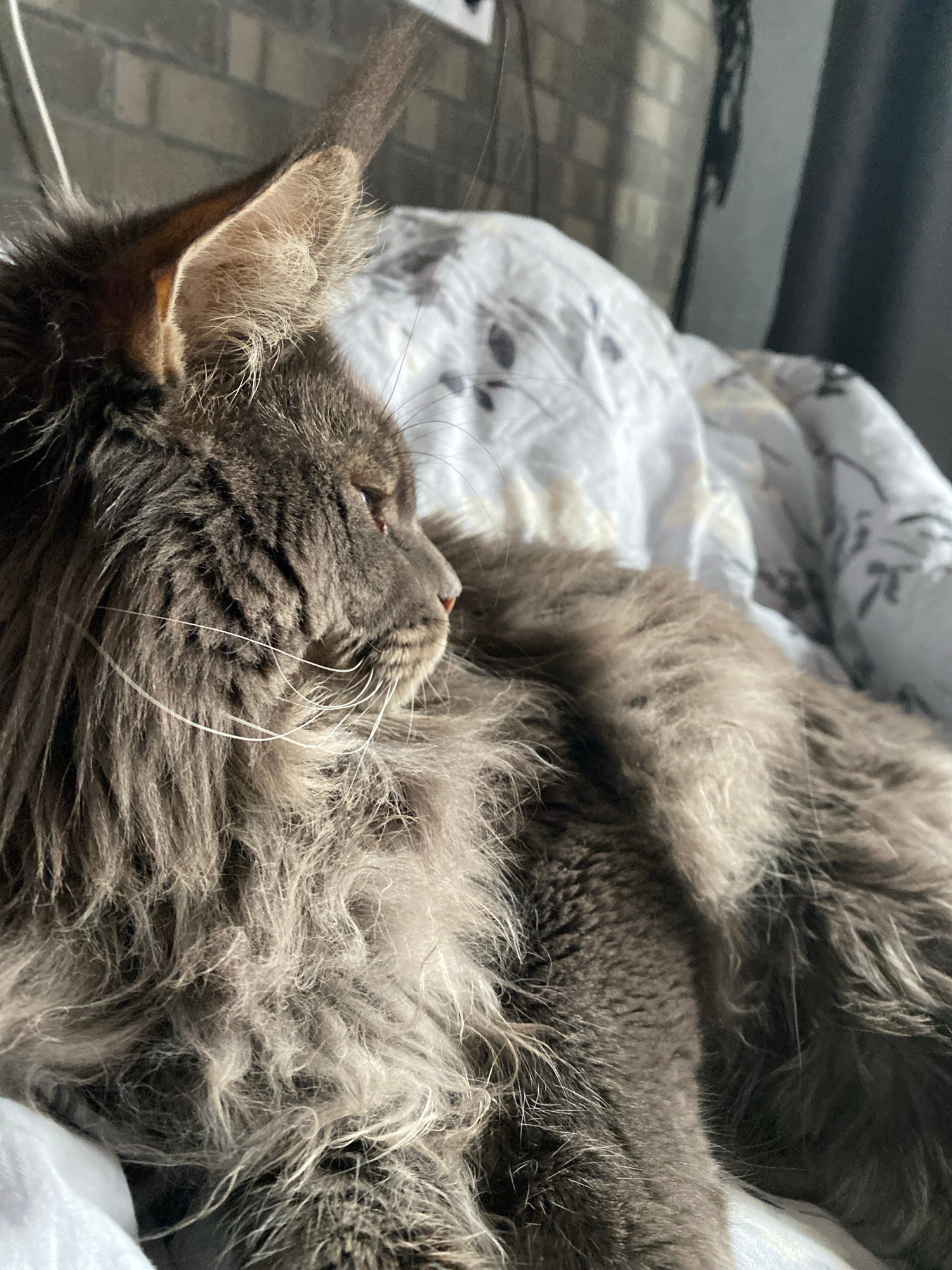A grey, long-haired cat is lying on a bed covered with a white and grey floral patterned duvet. The cat is viewed in profile, with its head towards the left of the frame and its body extending towards…read more