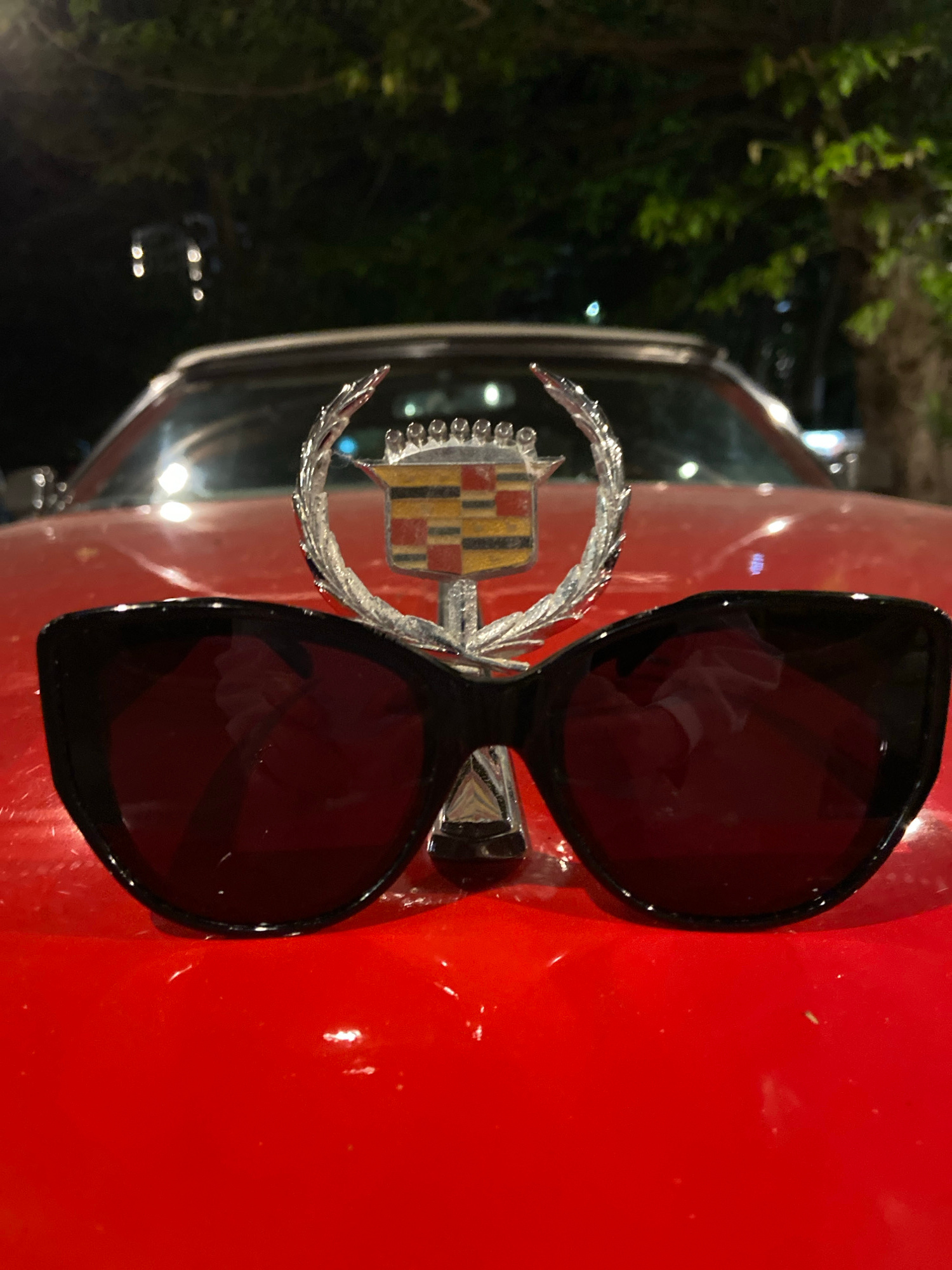 The image features a close-up of the hood of a red car. Resting on the hood are a pair of black-framed sunglasses and a Cadillac hood ornament. The left side of the frame includes parts of the car's w…read more
