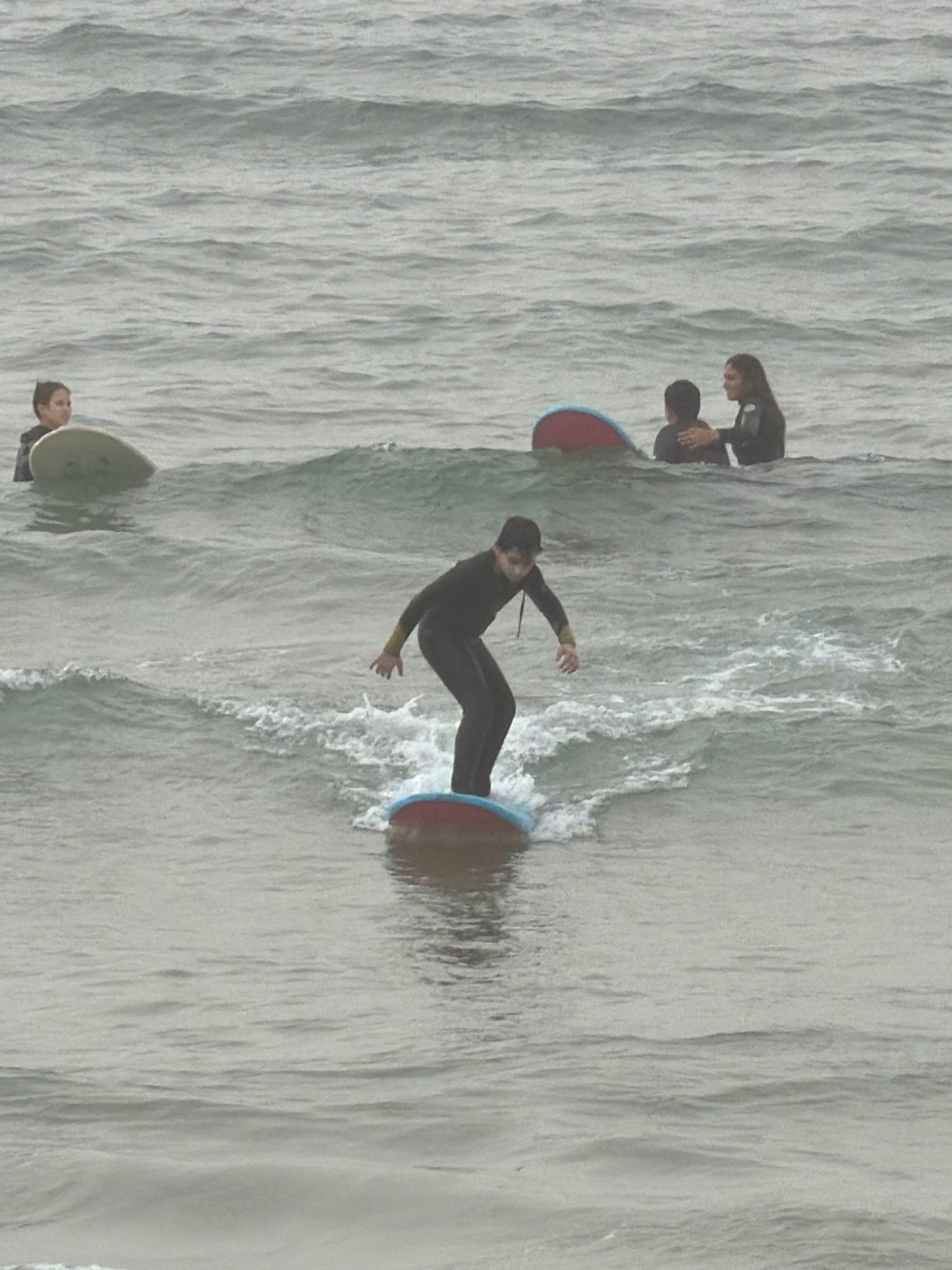 The vertically oriented image captures a water sports scene featuring four individuals in dark wetsuits engaged in bodyboarding or small-board surfing, set against a backdrop of rippling ocean water.…read more
