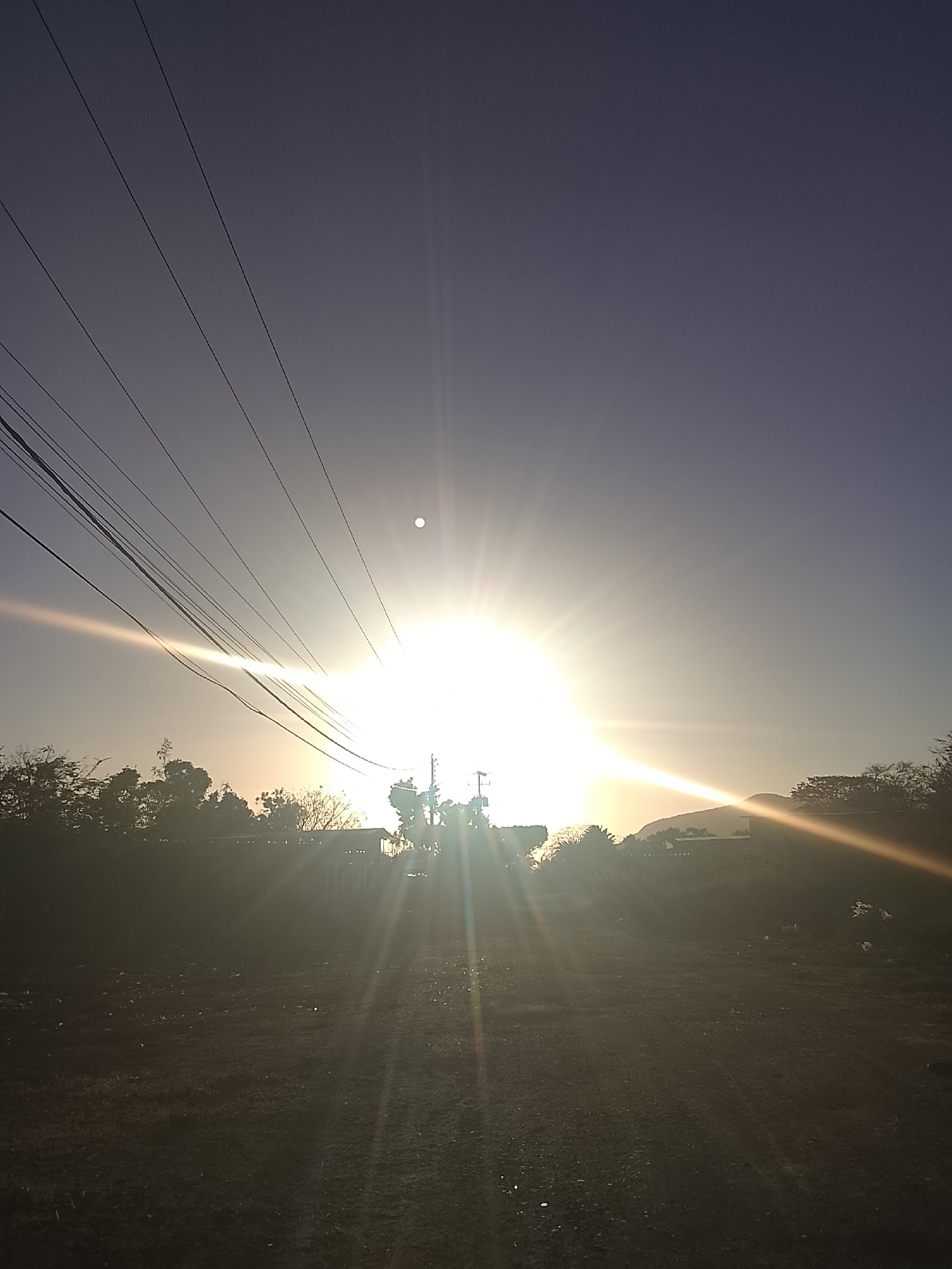 The image depicts a brightly illuminated scene at or near dusk or dawn. The light source, likely the sun, is intensely bright, positioned centrally in the upper portion of the frame, causing significa…read more