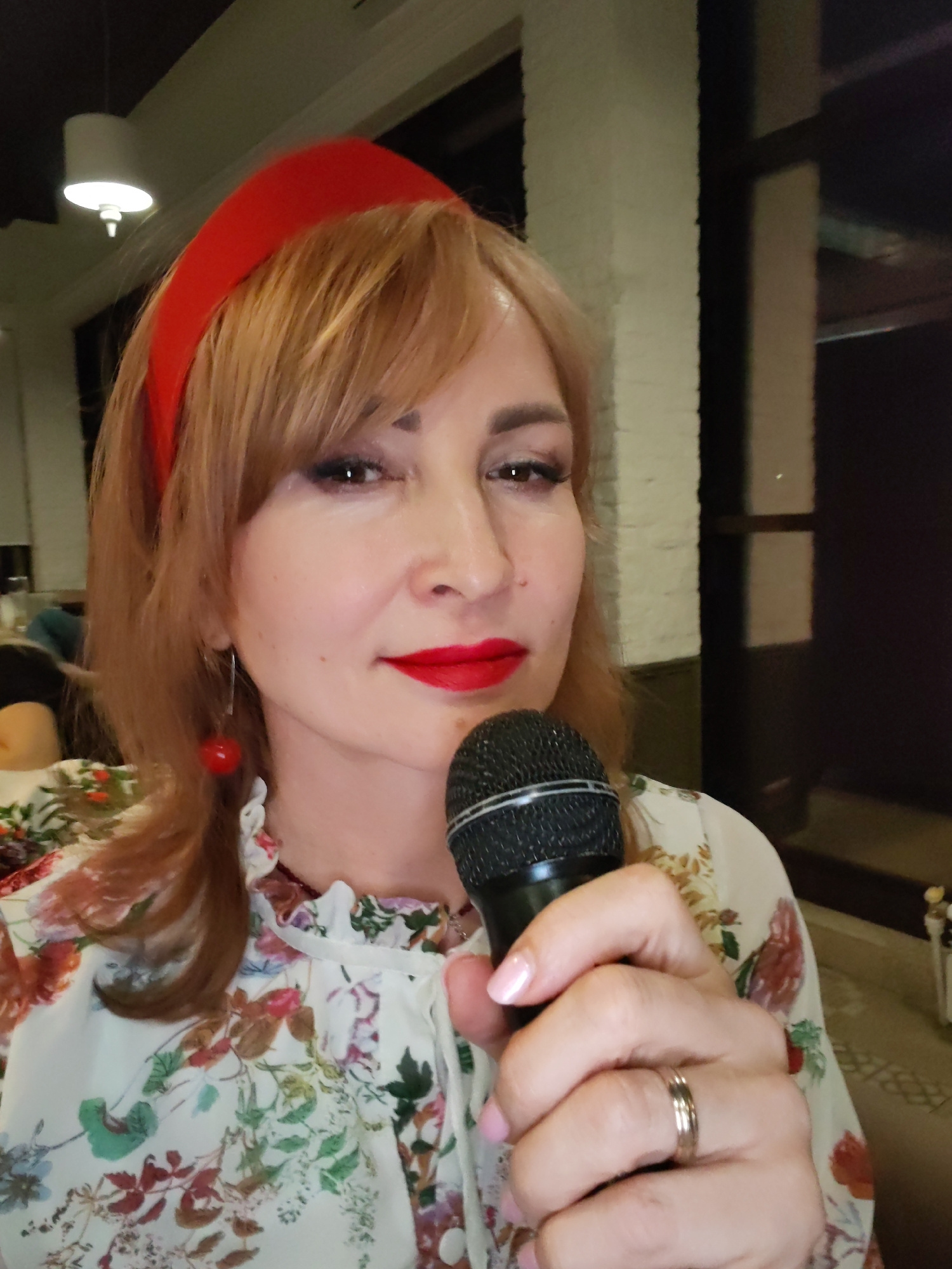 A woman is holding a microphone and facing the camera. She has red lipstick, wears a red headband, and has red cherry earrings. She is wearing a white floral shirt. On her ring finger is a ring. The l…read more