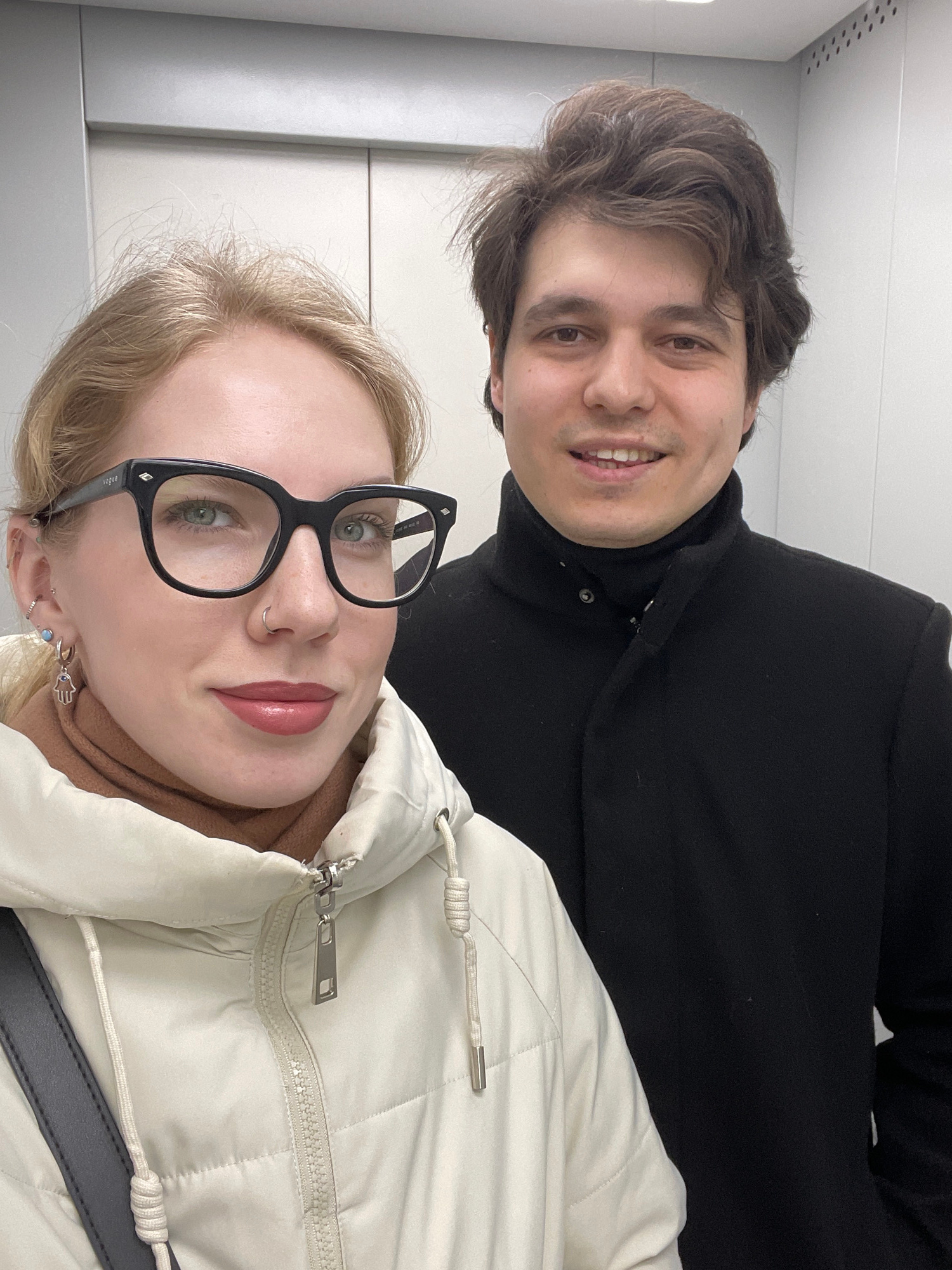 Two people are pictured indoors. A man with brown hair, wearing a black turtleneck or coat, is visible in the upper-left portion of the frame, smiling. A woman with blonde hair wearing black glasses a…read more