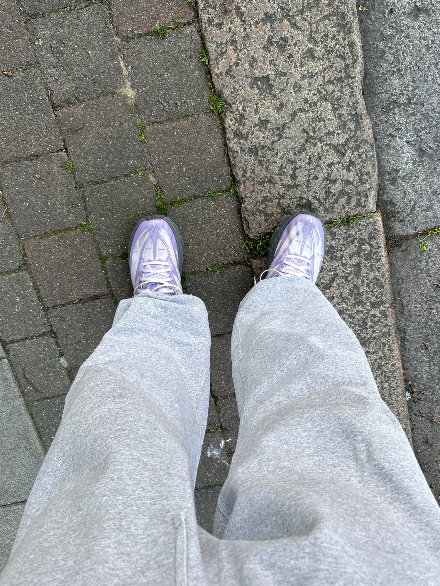 The image presents a top-down view of a person's lower legs and feet, likely taken outdoors on a street or sidewalk. The subject is wearing light heather grey, loose-fitting sweatpants that fall over…read more