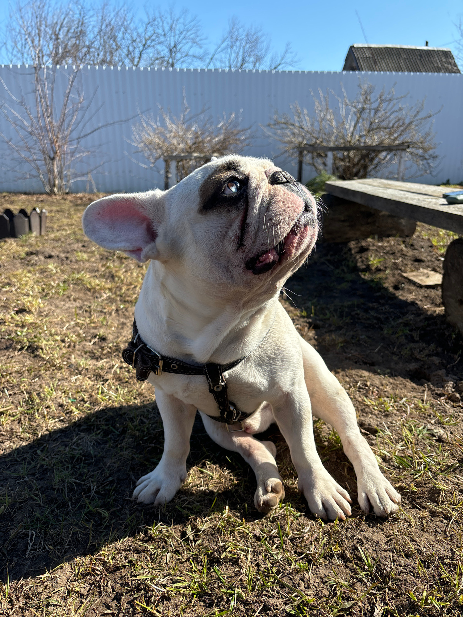 A white French Bulldog is depicted lying on its side or back on sparse ground cover, looking upwards with a relaxed expression. The dog has distinctive dark markings around its eyes and nose, contrast…read more