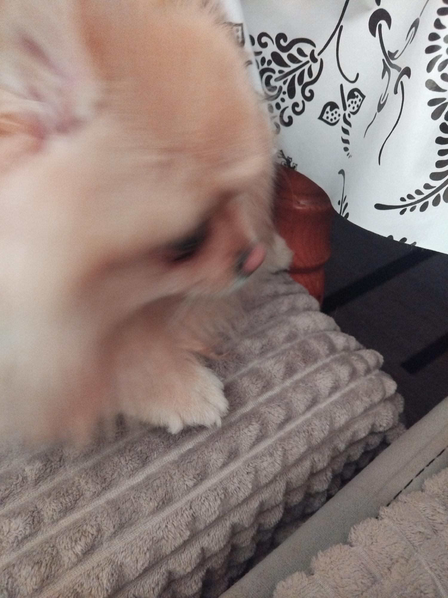 The image shows a blurred, light-colored dog (possibly a Pomeranian) with a paw resting on a gray, textured blanket or cushion. Part of a decorative patterned fabric or curtain is visible in the backg…read more
