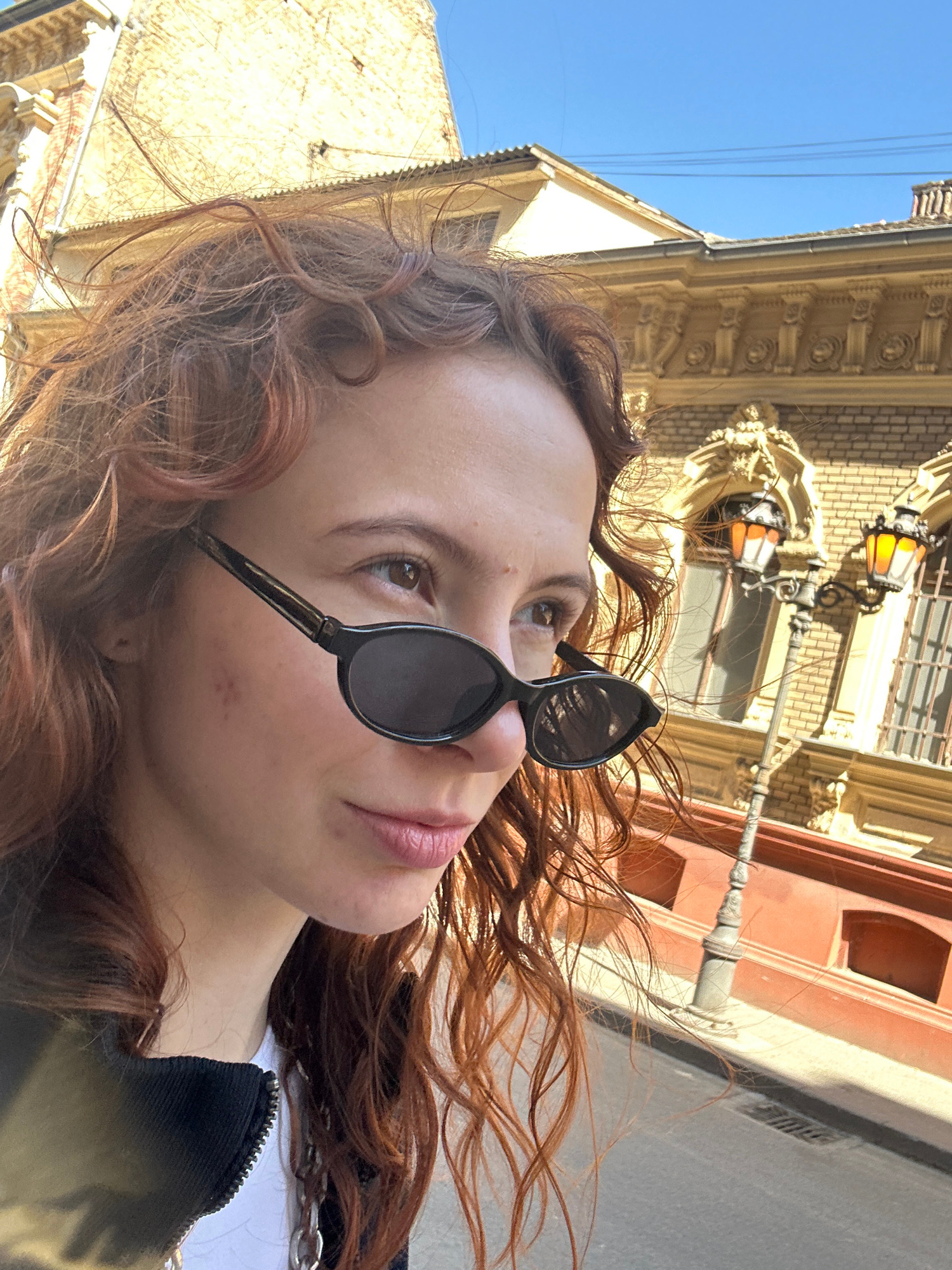 A selfie of a woman with curly red hair and sunglasses, outdoors on a sunny day. She is wearing a black jacket with a silver chain. The background includes buildings and a street lamp. This image appe…read more