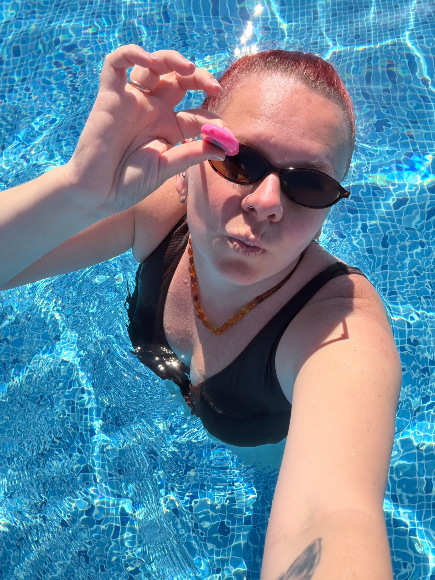 A fair-skinned individual, possibly female, is depicted waist-deep in a blue-tiled swimming pool. The person is wearing a black swimsuit and sunglasses, and has short, reddish-brown hair. They are hol…read more