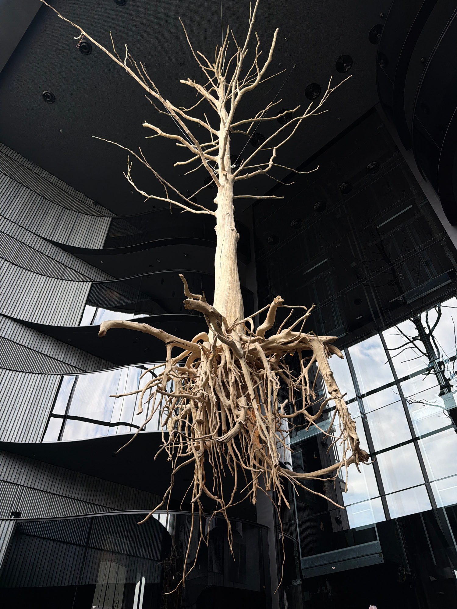 A large, light-colored, gnarled tree trunk or root system, appearing as a piece of deadwood or driftwood art, is suspended horizontally across the upper portion of a modern interior. Its intricate bra…read more