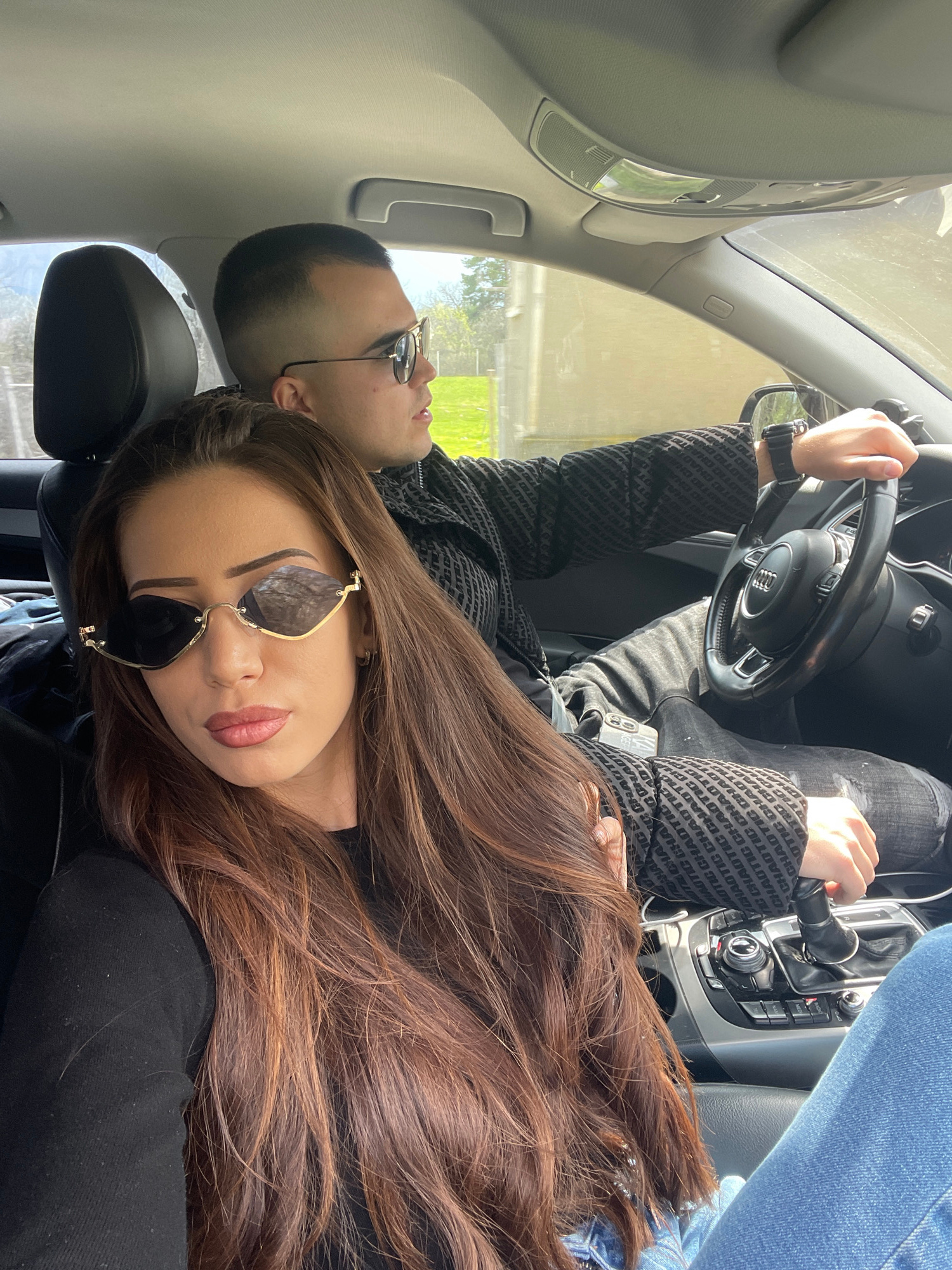 Two people are in a car. A woman with long brown hair is reclined in the passenger seat, facing the camera and wearing sunglasses. A man with short, cropped hair is behind the wheel of the car, holdinβ¦read more