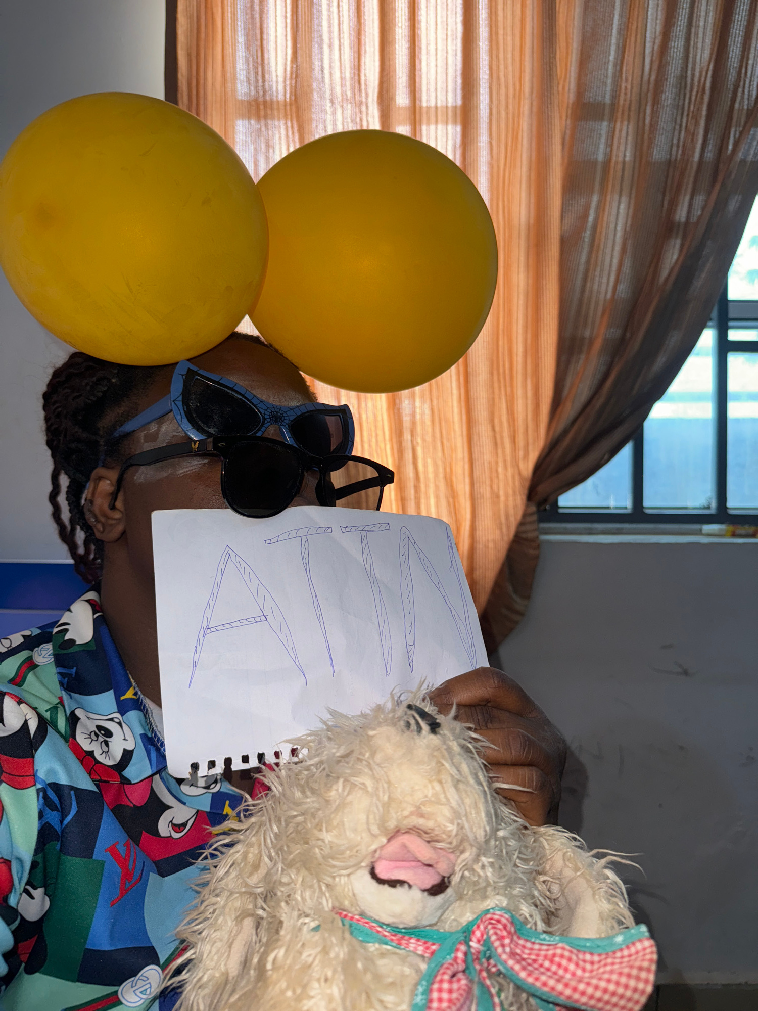 The image depicts a person indoors in Sabon Tasha, Nigeria. The person is wearing sunglasses, and two yellow balloons are positioned near their head. They are holding a piece of paper with writing inβ¦read more