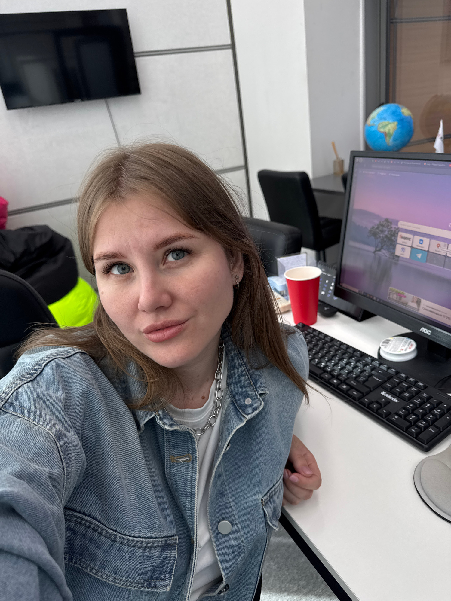 A woman with light brown hair and blue eyes, wearing a denim jacket and a silver chain necklace, sits at a desk. On the desk, there is a computer monitor, a keyboard, a mouse, and a red cup. A small g…read more