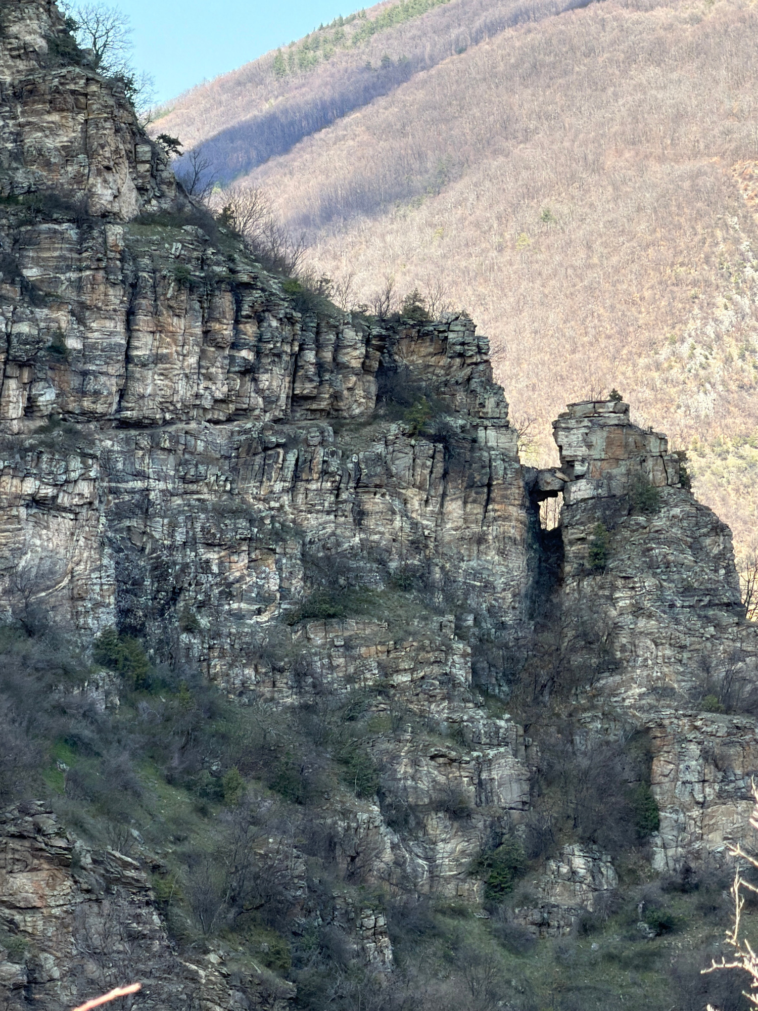 The image shows a close-up of a rocky cliff face with a natural archway or opening near the top. The cliff is composed of layers of rock, with visible stratification and some vegetation clinging to th…read more