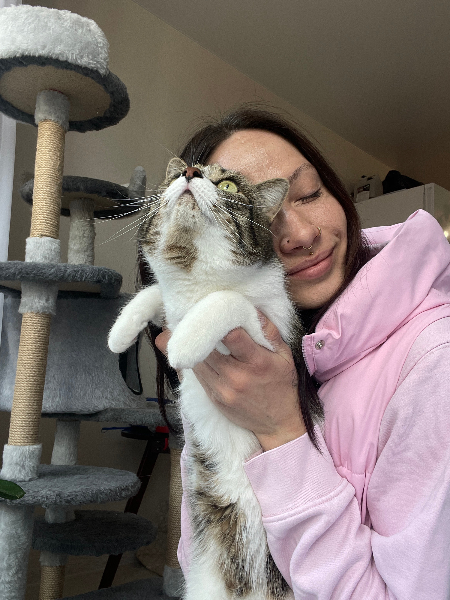 This image, taken in Izhevsk, Russia, depicts a person cuddling a cat in an indoor setting. The main subject is a woman with dark hair, seen from her nose upwards, with her eyes closed, suggesting a m…read more