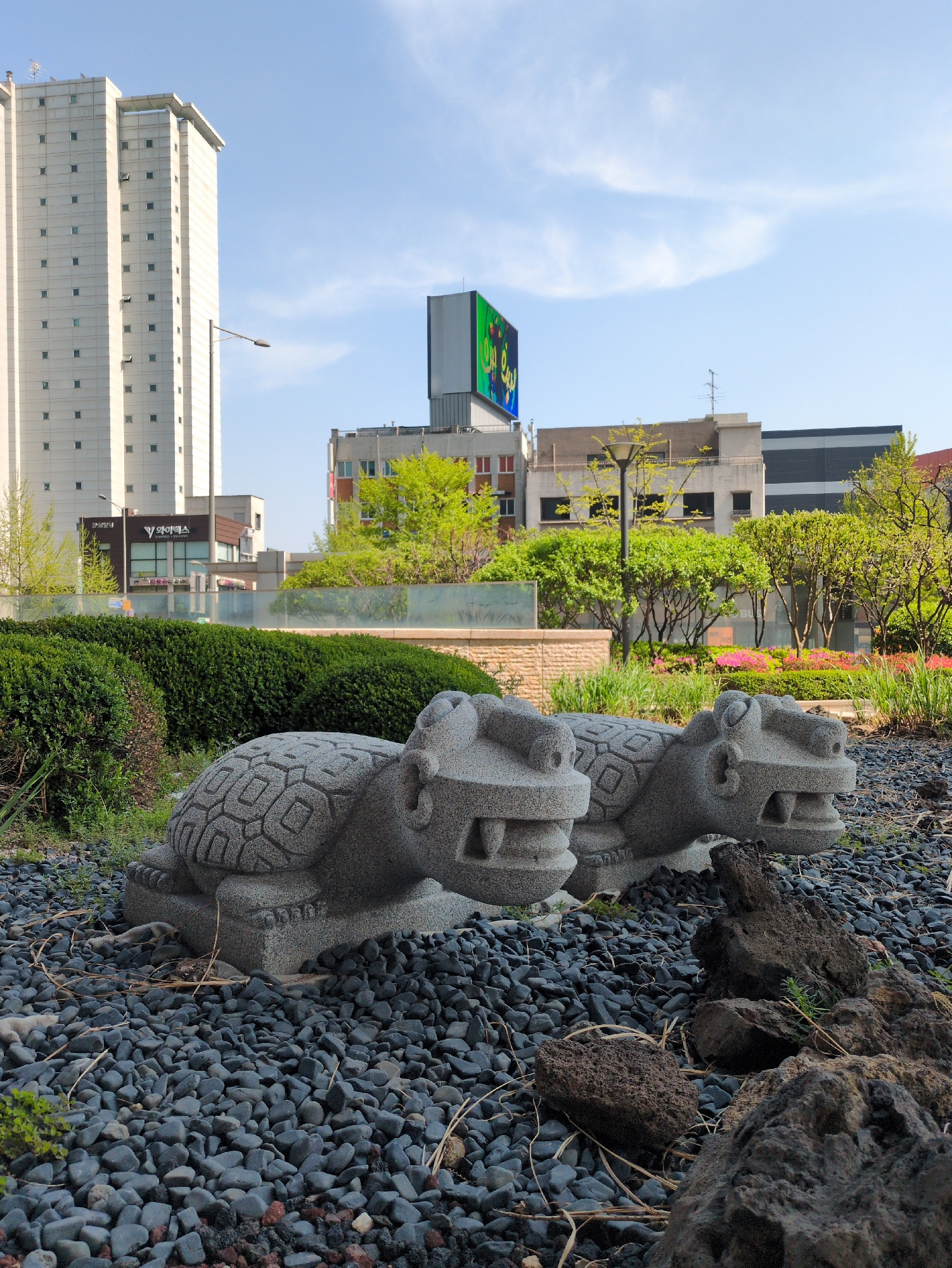 This landscape-oriented photograph depicts two stone turtle sculptures situated among black gravel and volcanic rock. The sculptures are grayish and feature intricate designs on their shells. Behind t…read more