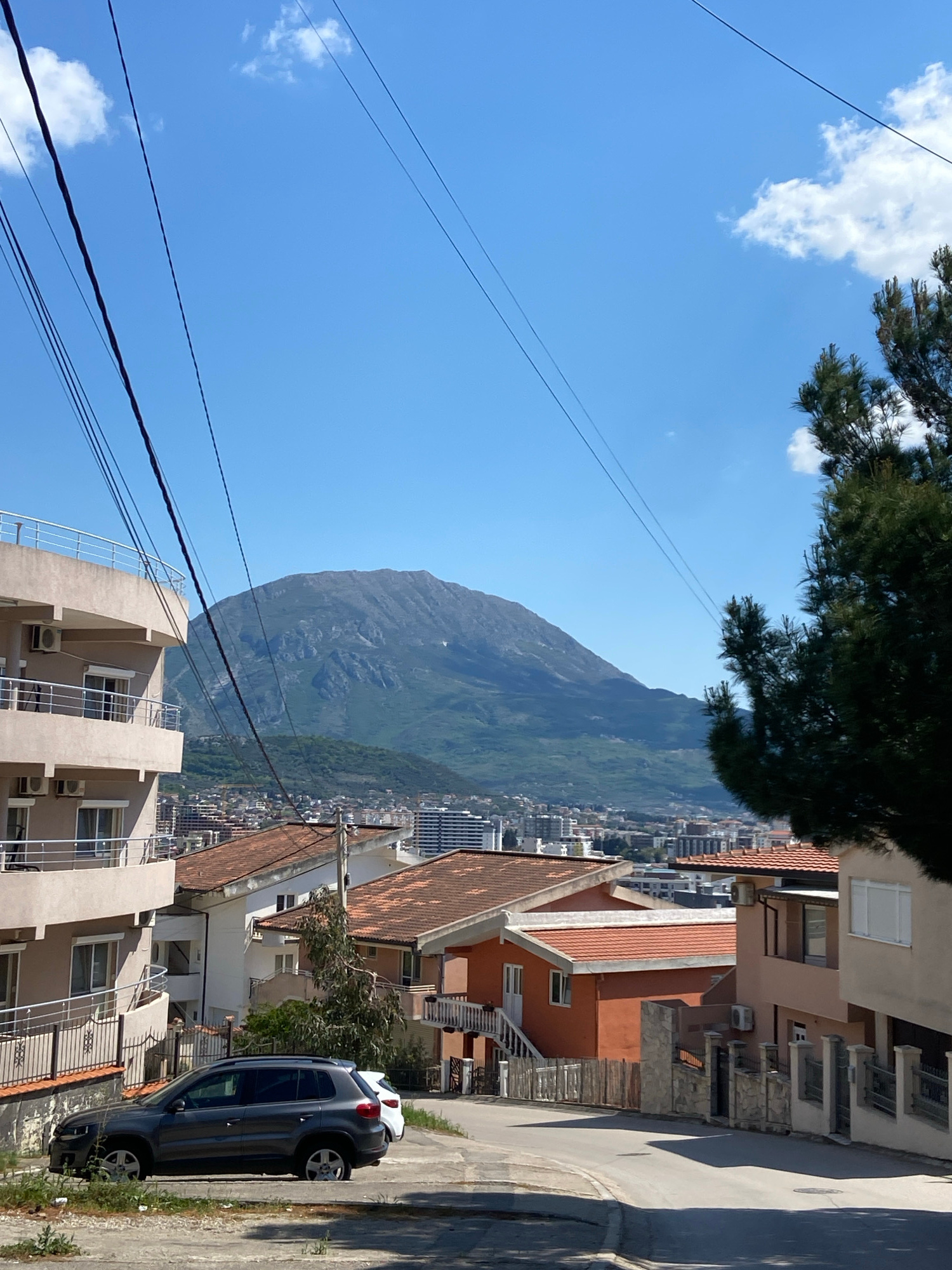 The scene depicts a street in Šušanj, Montenegro, viewed from a slightly elevated position. Buildings with orange-tiled roofs and beige facades line the right side of the street. A dark grey car is pa…read more