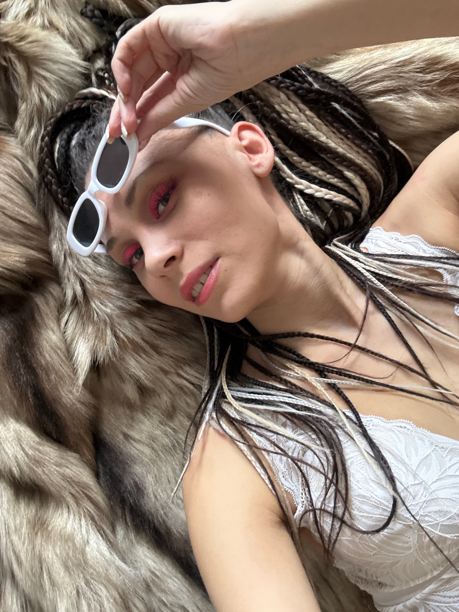A woman with braided hair, wearing a white lace top, is lying on a furry surface. She is holding a pair of white-framed sunglasses near her face. The scene appears to be indoors. The location informatβ¦read more