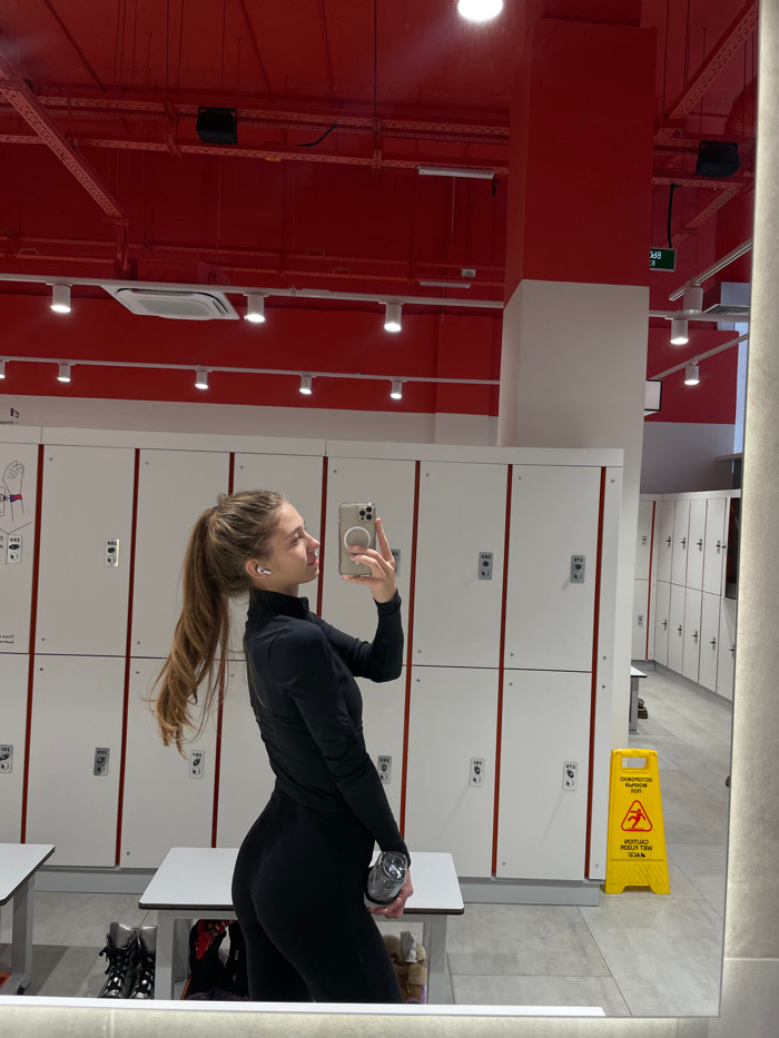 A woman in black workout clothes takes a mirror selfie in a gym locker room. Her hair is pulled back into a ponytail. In her hand, she holds a phone and a water bottle. The locker room features white…read more