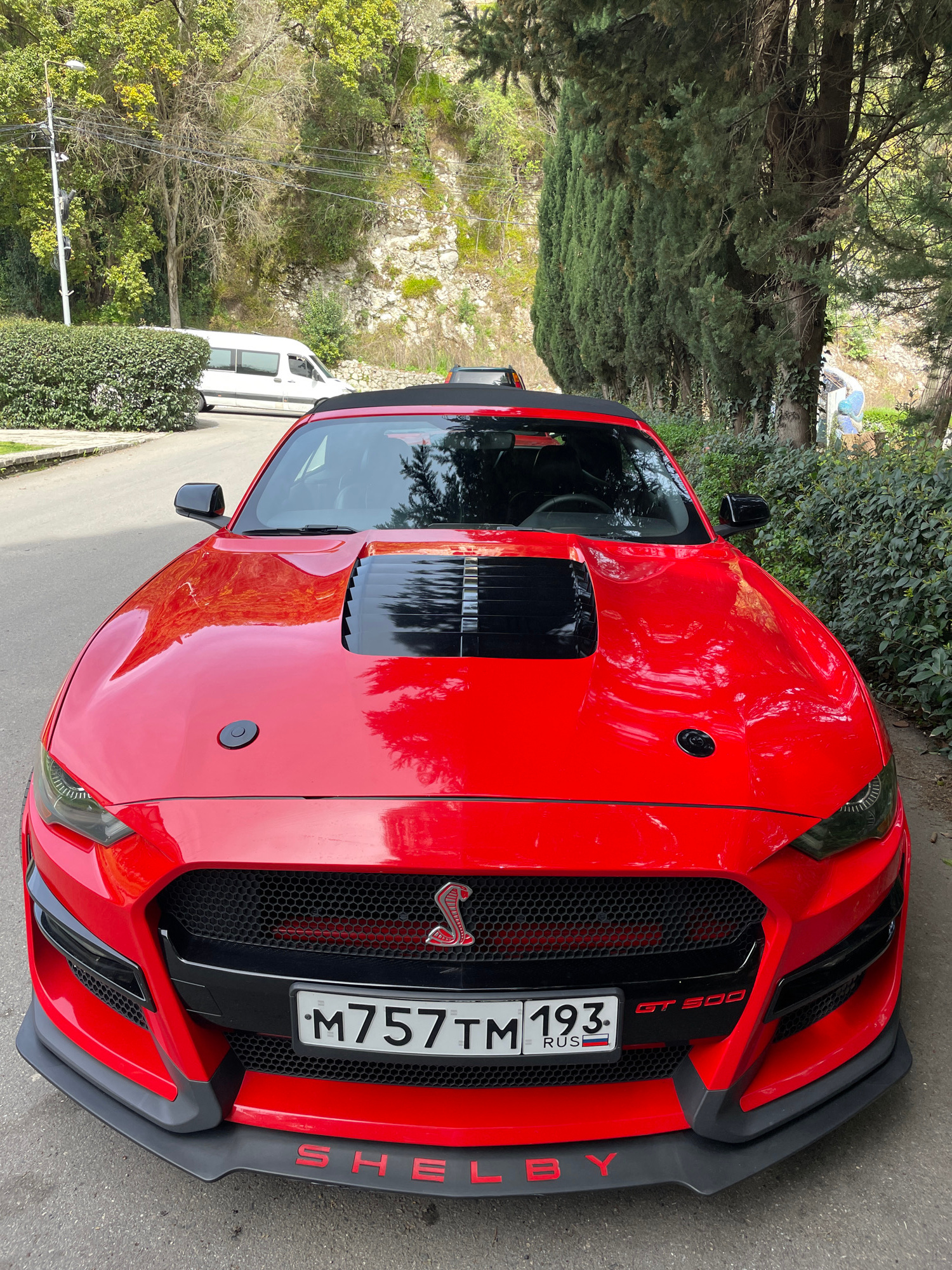 A red Shelby GT500 sports car is parked on an asphalt road. The car's front end is prominently displayed, including the grille, bumper, hood scoop, and license plate (M757TM 193 RUS). The background i…read more