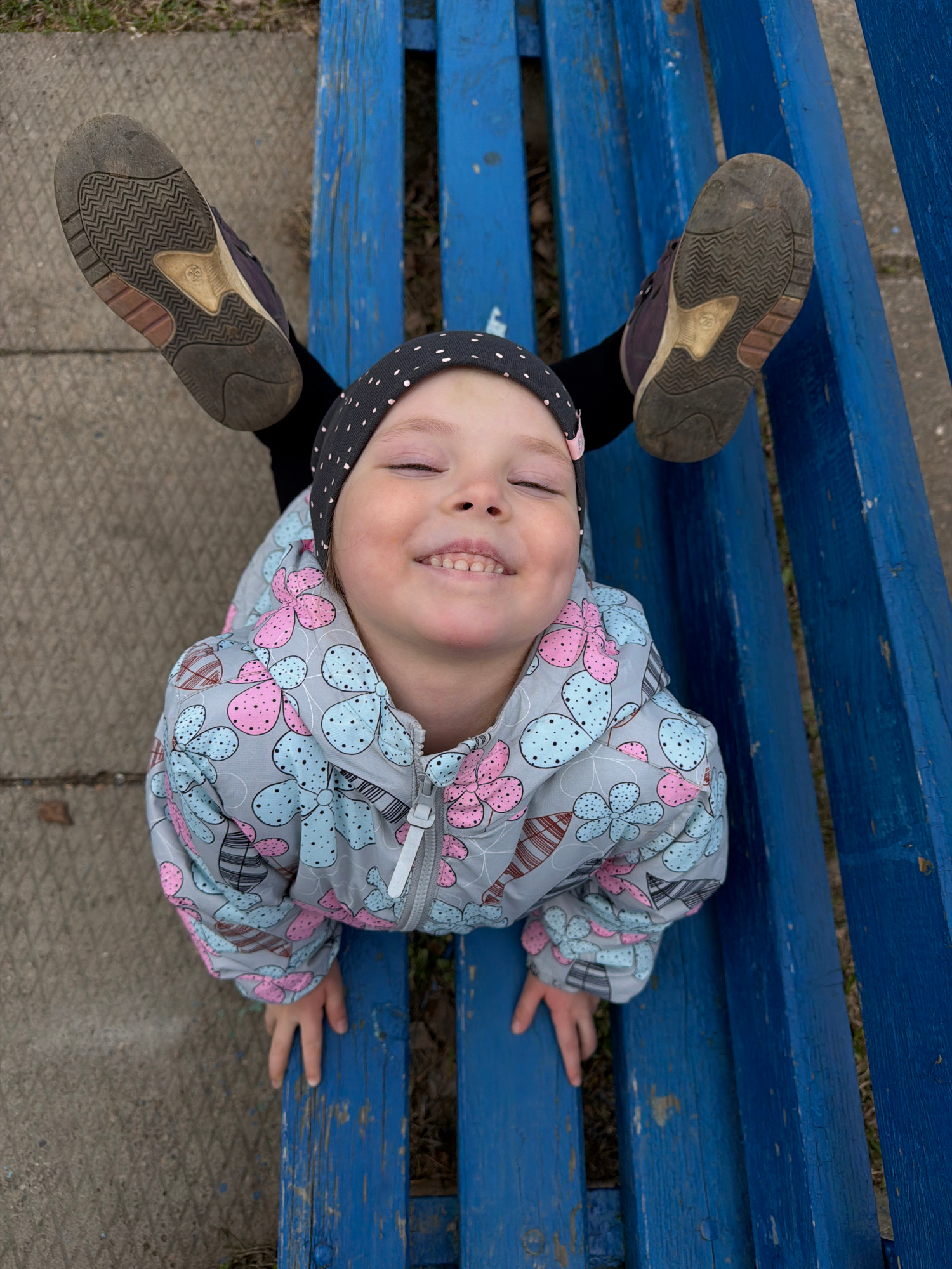 A young child lies on a blue, wooden bench outdoors, likely in a park or public space in the city of Votkinsk, Russia. The child wears a light gray jacket with a floral pattern of pink and light blue…read more