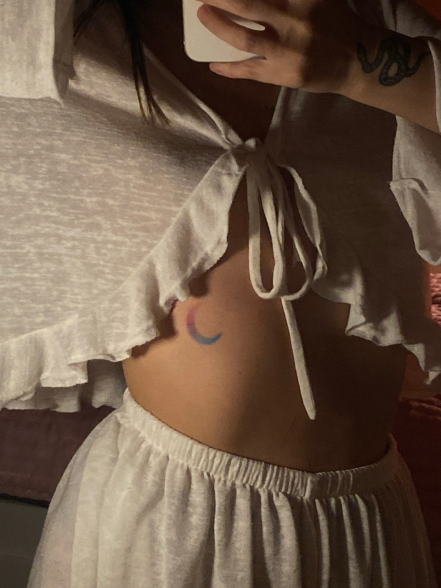 A person is seen in a low-lit indoor setting. They are wearing a white, ruffled top with drawstring detailing. On their left wrist is a snake tattoo. On their upper torso, visible under the top, is a…read more
