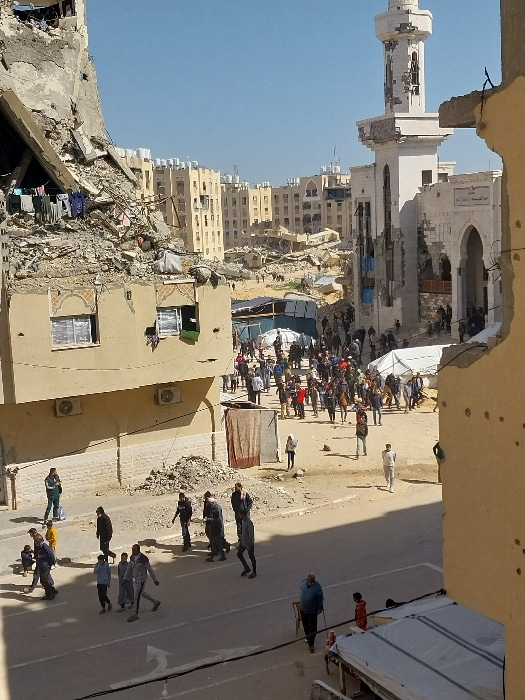 This image depicts a severely damaged urban environment in Khan Yunis, Palestinian Territory, under a clear blue sky. The scene is observed from an elevated position behind a damaged, yellow-painted w…read more