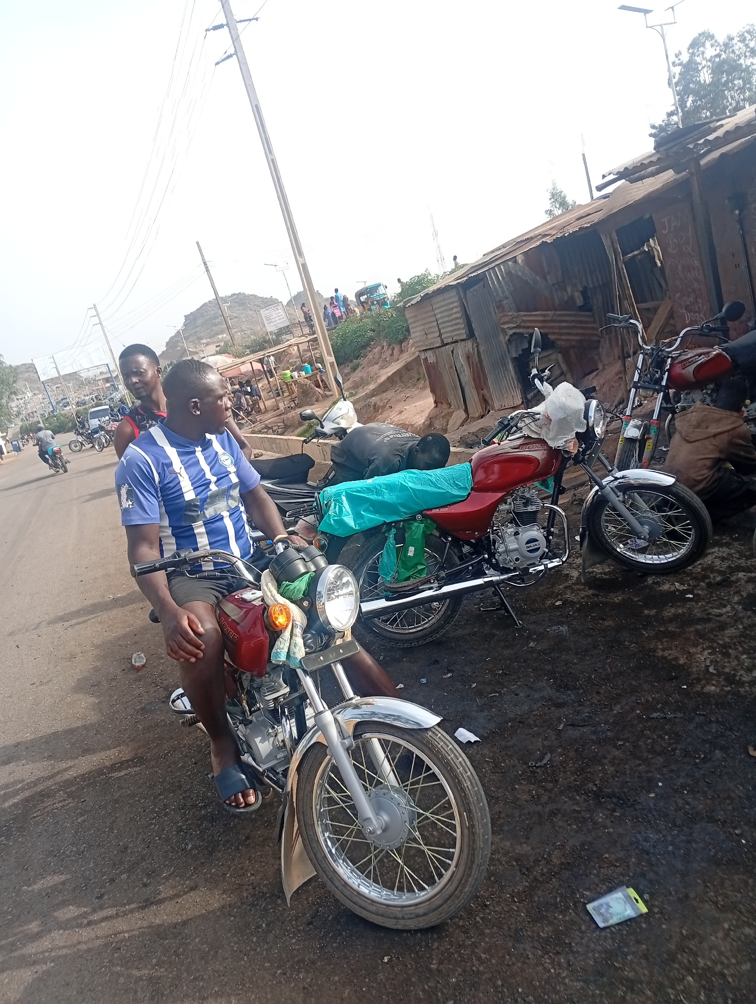The image depicts two men on a red motorcycle on a road in Jos, Nigeria. The man in the front is wearing a blue and white striped shirt, and the other is wearing a red top. Two other motorcycles are p…read more