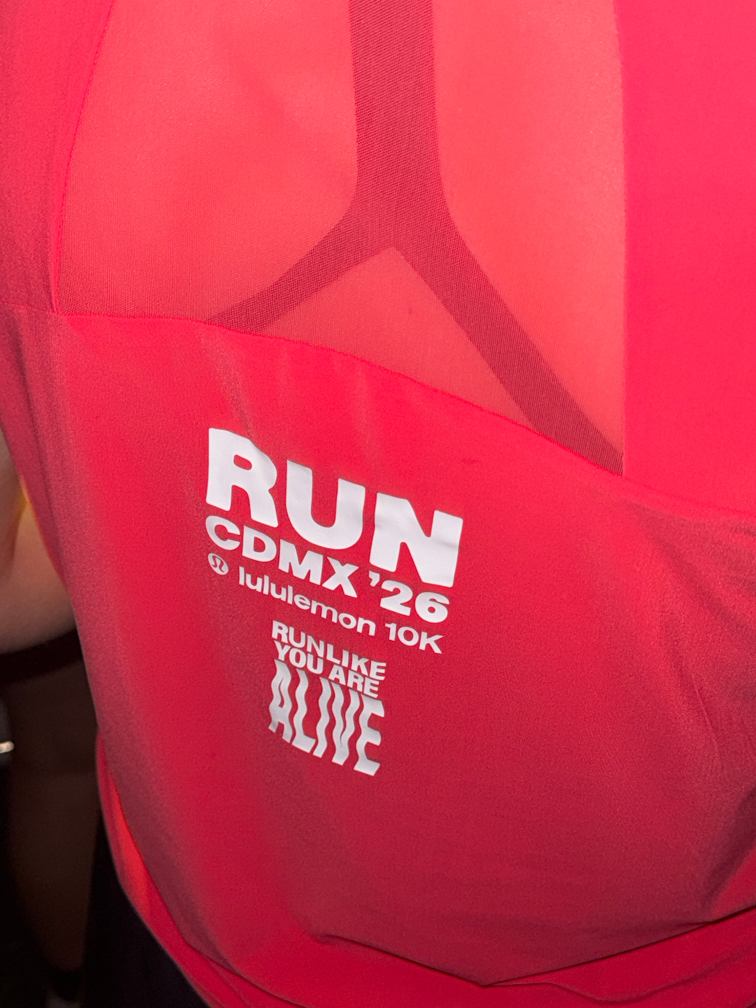 The image depicts a red running shirt with a white graphic that reads "RUN CDMX '26 @lululemon 10K" and "RUN LIKE YOU ARE ALIVE" with a wavy design. The shirt also features a mesh panel in the front.…read more