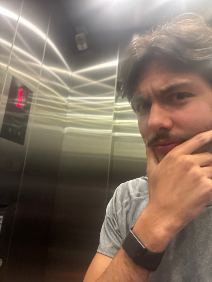 The image displays a male individual, appearing to be in his 20s or 30s, inside a polished metal elevator. The subject occupies the right half of the frame, facing the camera directly, suggesting a se…read more
