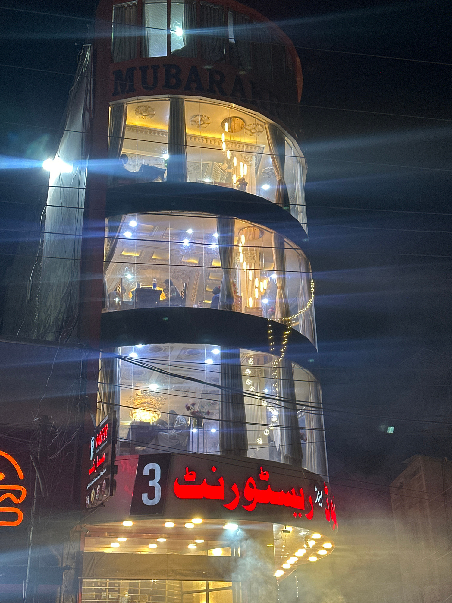 The image depicts a building named "Mubarak" in Quetta City Tehsil, Pakistan, at night. The building features a distinctive, curved architectural design with glass windows across multiple levels. The…read more