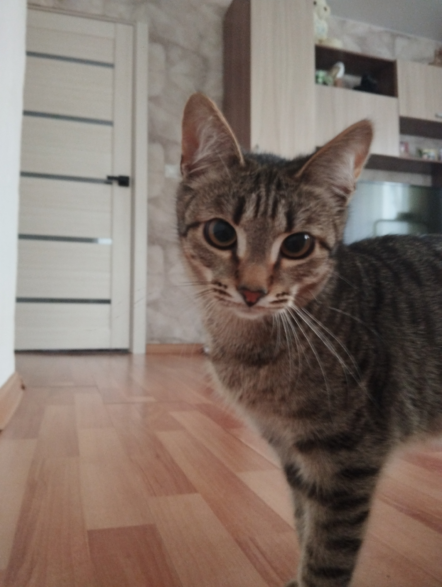 A domestic cat is positioned in the foreground of an interior space, its gaze directed towards the viewer. The cat is a tabby with gray and brown fur, featuring stripes on its coat and a distinctive p…read more