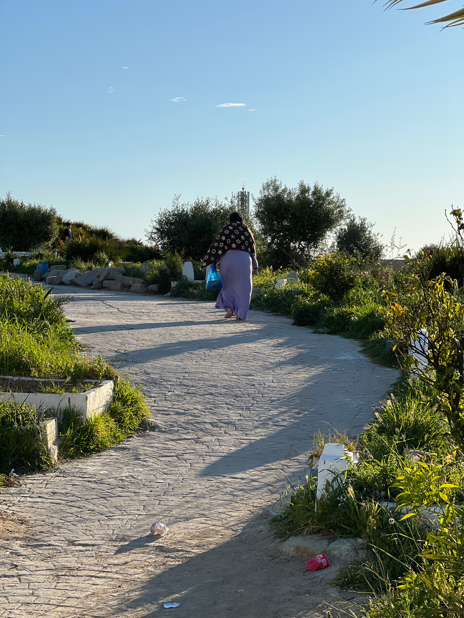 A medium shot of a woman in a lilac robe with a dark brown and black patterned head covering, walking on a light grey brick-paved path. She is holding a blue plastic bag. The path is bordered on bothβ¦read more