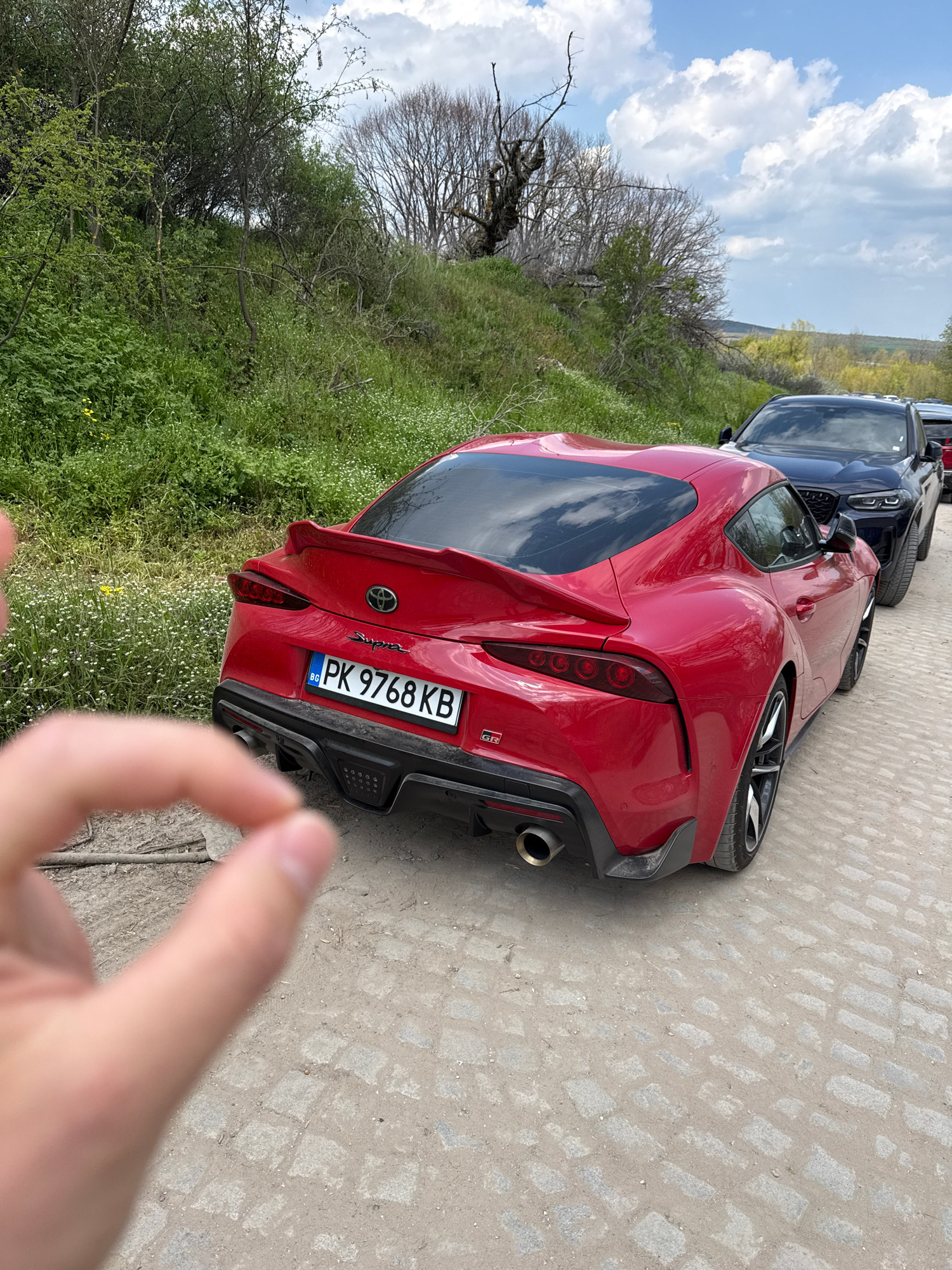 The image depicts a red Toyota Supra parked on a cobblestone road, likely in a rural or semi-rural area. A dark blue car is partially visible behind the Supra. The Supra's license plate reads "PK 9768…read more
