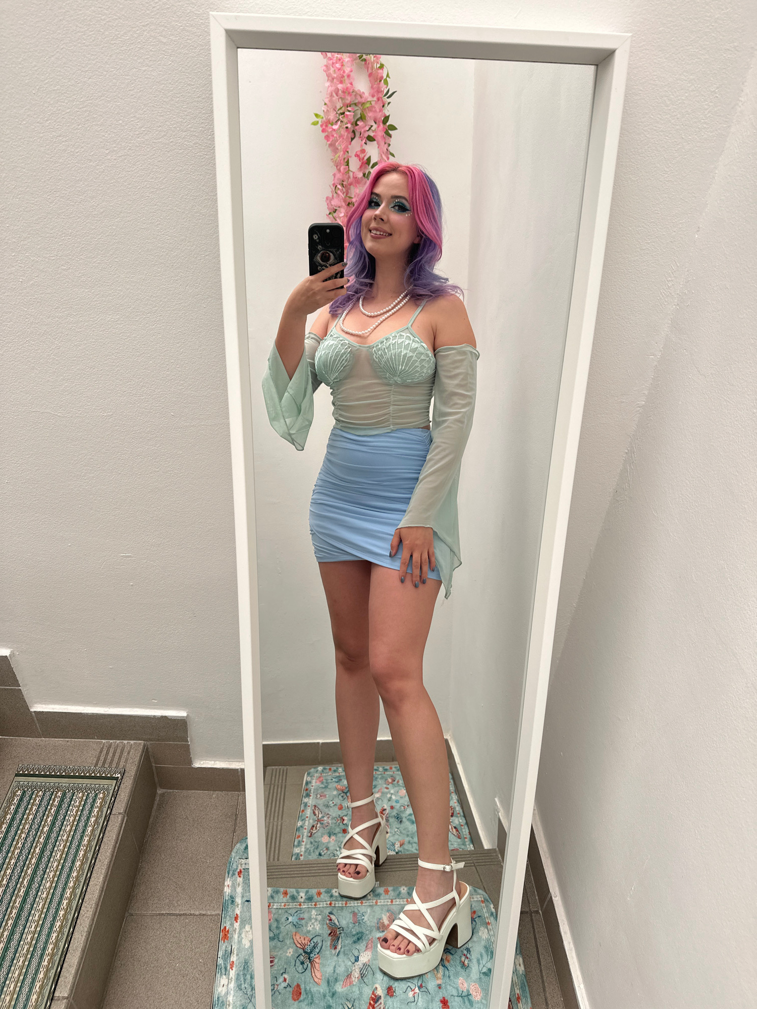 A woman with purple and pink hair is taking a selfie in a mirror. She is wearing a light blue dress with a shell-shaped top and white platform sandals. To her left are pink flowers. The mirror is lean…read more