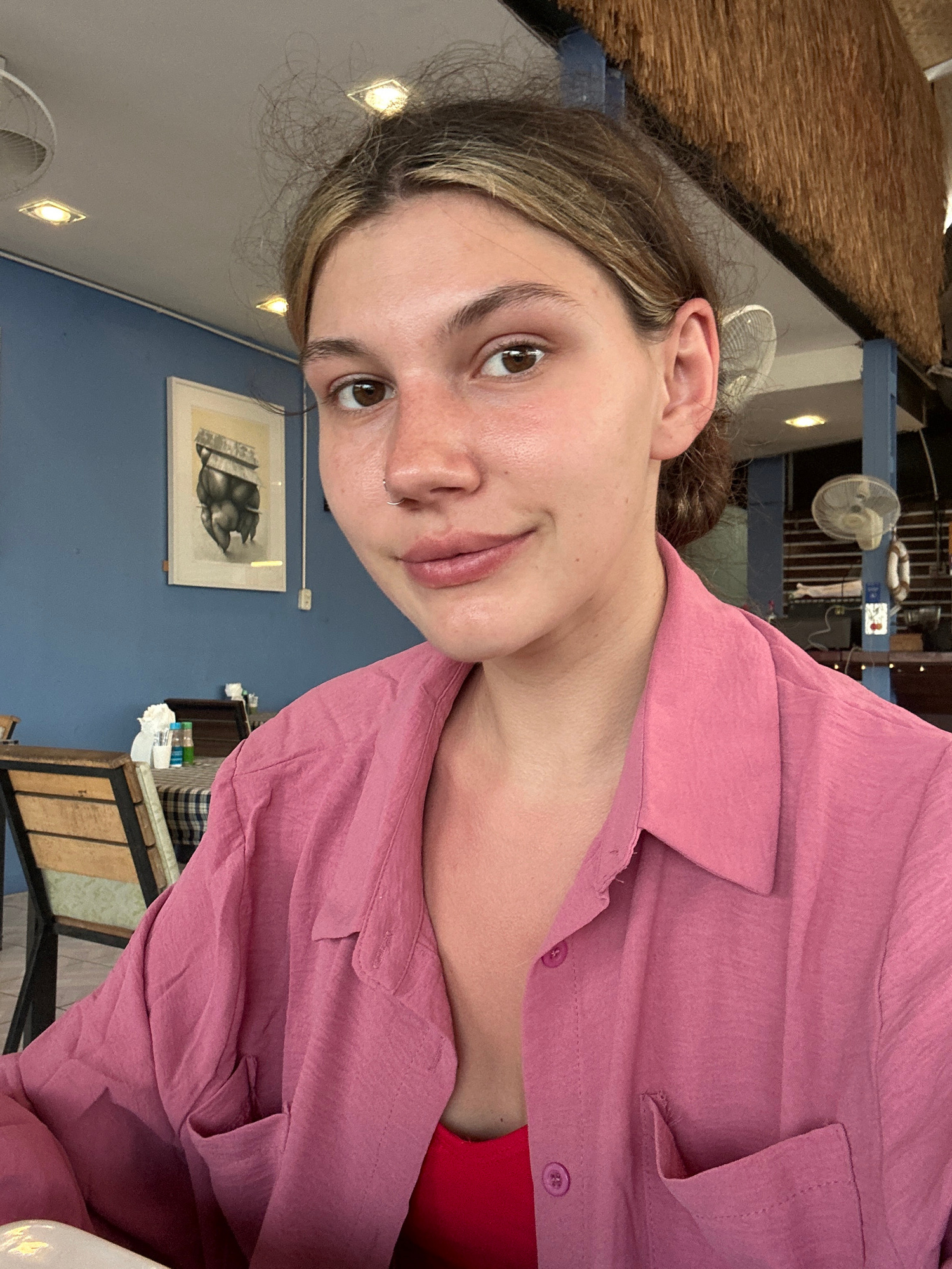 The image shows a young woman in a pink button-down shirt. She has brown eyes, a nose ring, and her hair is pulled back. The background features a blue wall with a framed print of an animal, possibly…read more