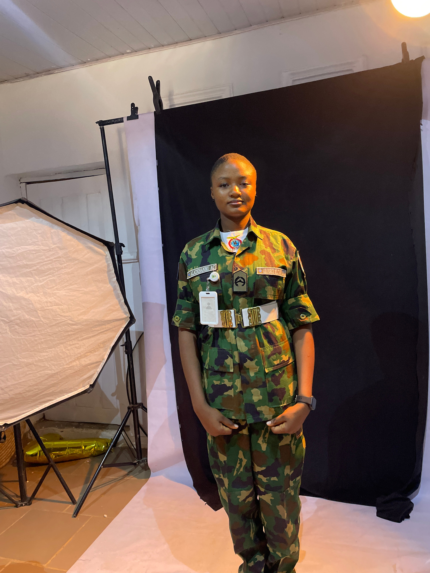 The image shows a person wearing a military camouflage uniform standing in front of a black and white backdrop. The person has short hair, a wristwatch on their left wrist, and several patches and tag…read more