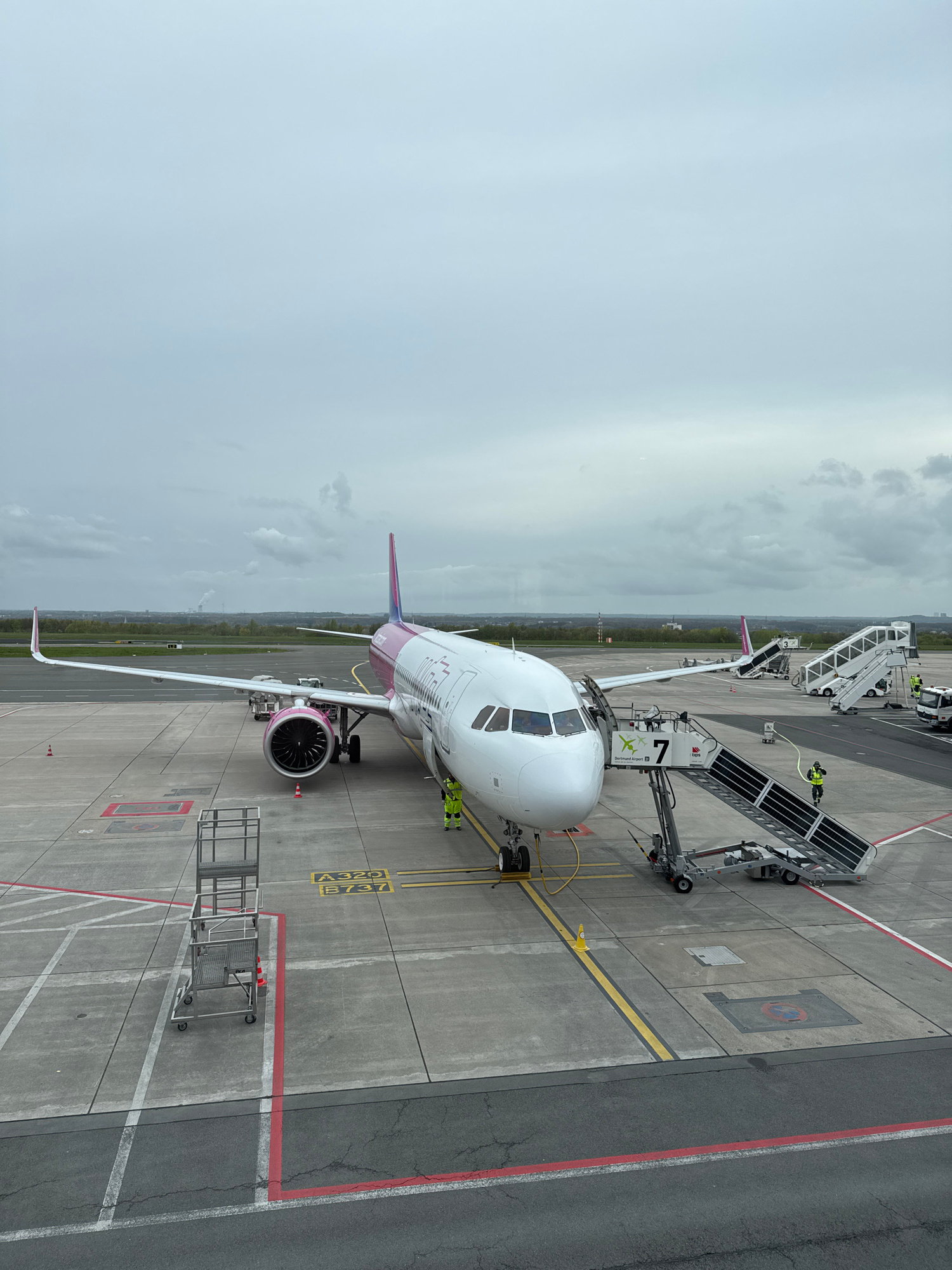 A Wizz Air Airbus A321-200 aircraft, registration HA-LXM, is parked at Gate 7 at Dortmund Airport (DTM) in Dortmund, Germany. The aircraft is connected to a jet bridge and stairs, and ground personnel…read more