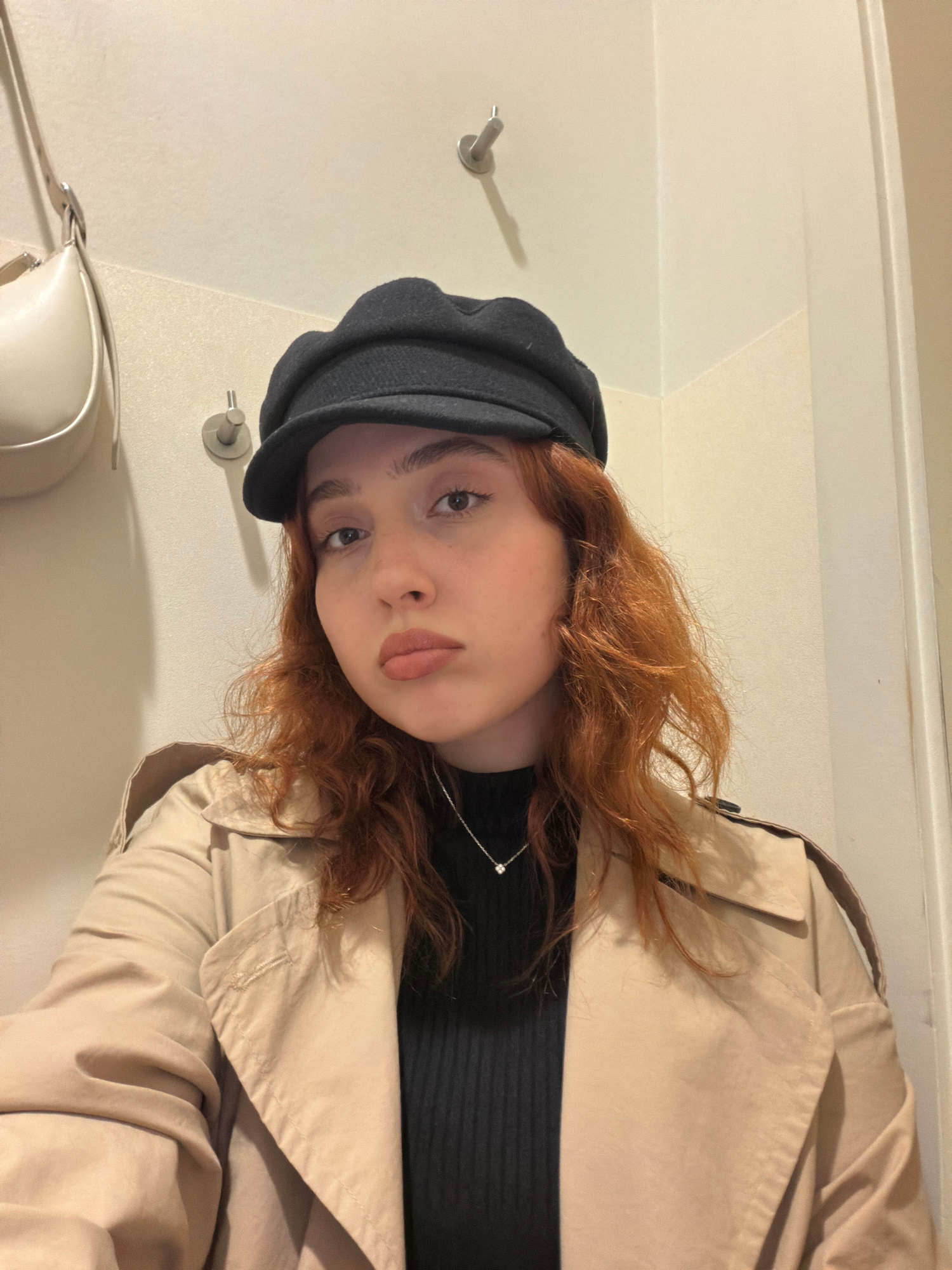 A young, fair-skinned woman with red curly hair, wearing a black sweater, a beige trench coat, and a black hat, is looking at the camera. She has a necklace on. The background consists of a white wall…read more