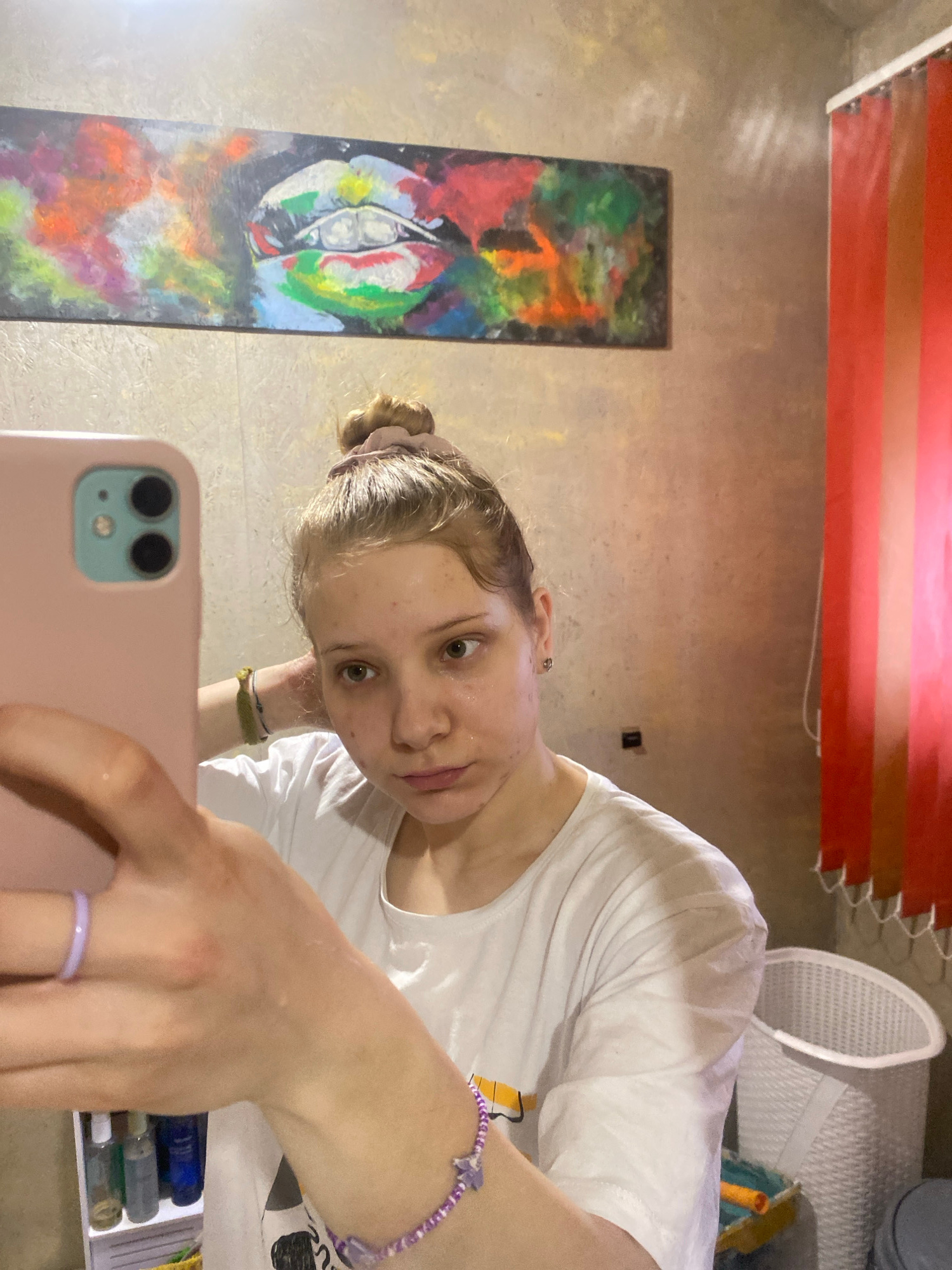 A young woman takes a selfie in a room. She wears a white t-shirt, and has her blonde hair in a bun. A smartphone is visible in the foreground. A painting hangs on the wall to her left. Red and orange…read more