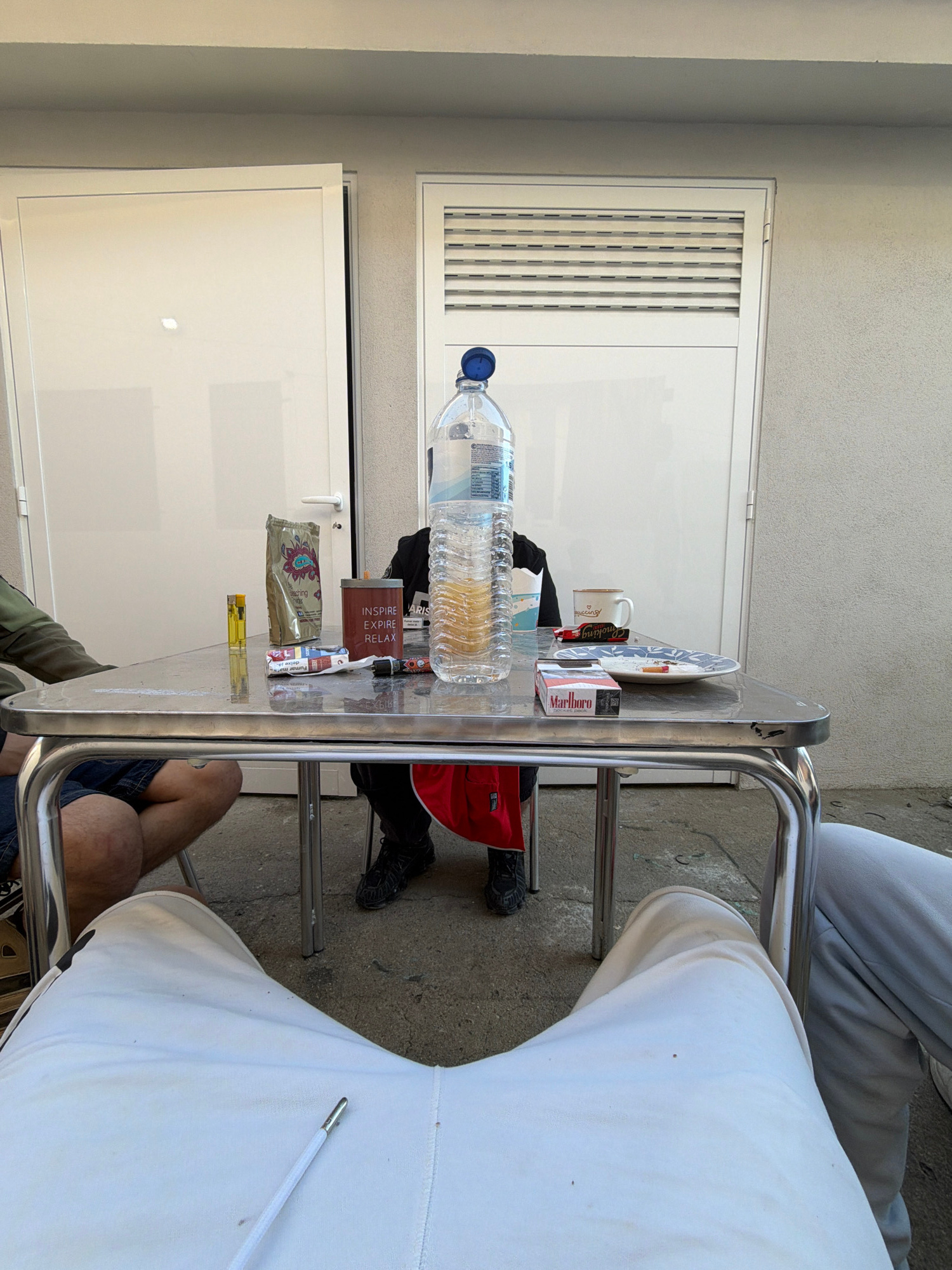The image depicts an outdoor scene, seemingly on a balcony or patio in Vila Real, Portugal. A metal table is central to the view, cluttered with various items: a large bottle of water, a pack of Marlb…read more