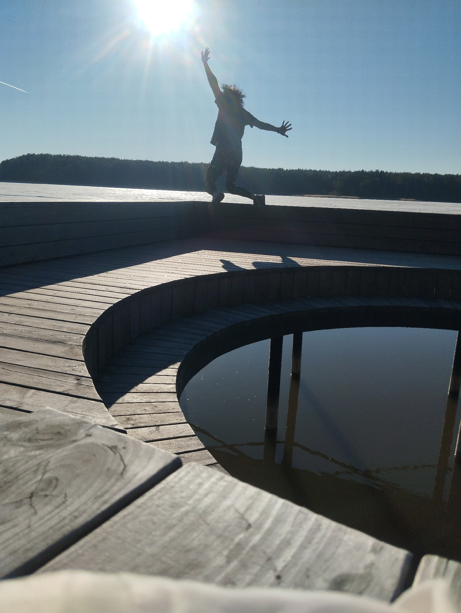 A person is captured mid-air in a jump on a wooden deck, with arms outstretched, against a bright sky and sunshine. The background includes a frozen lake and a treeline. The deck features a circular p…read more