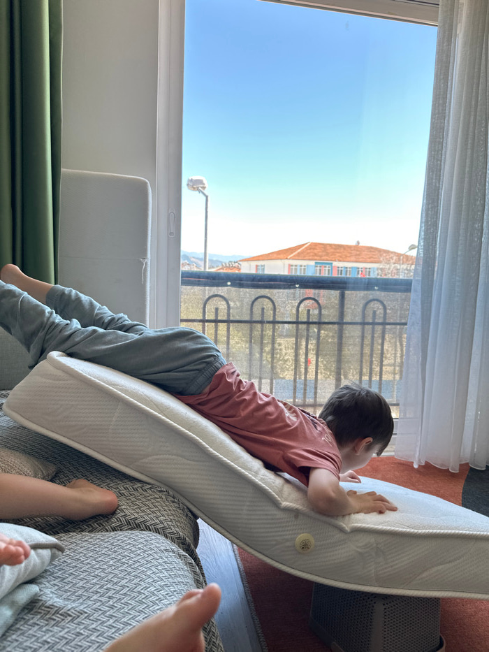 A young child, wearing a red t-shirt and light gray sweatpants, lies on their stomach on a white, inclined mattress. The mattress is angled with its higher end resting on a gray upholstered sofa or be…read more