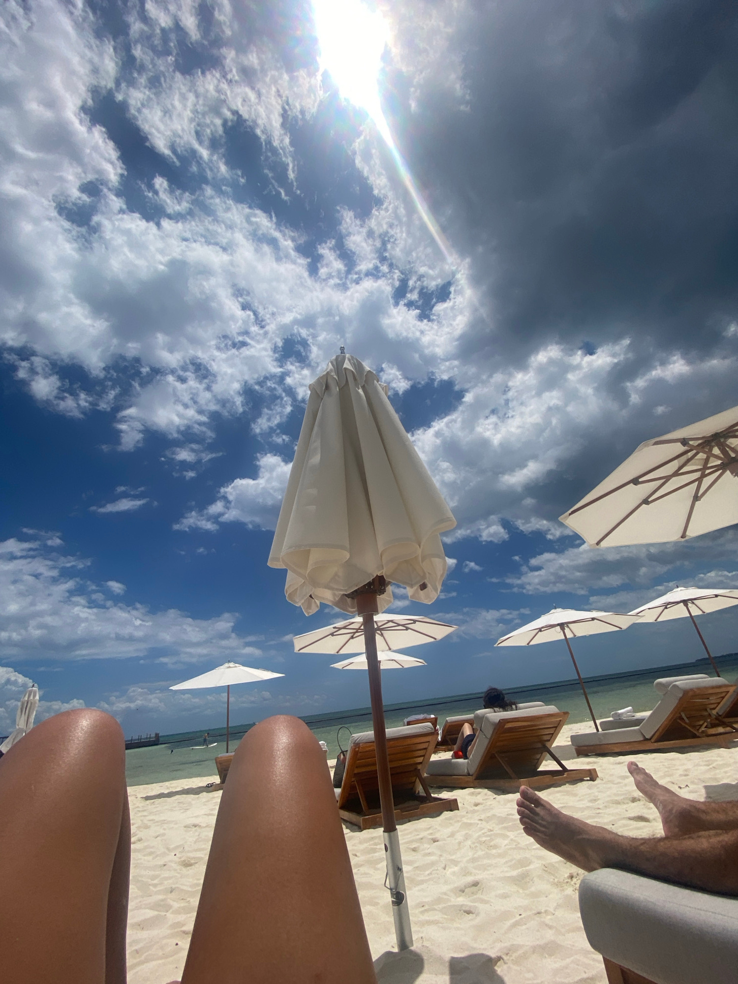 The image captures a beach scene in Marina Maroma, Mexico. The perspective is from someone reclining on a beach chair, looking upwards. The sky is predominantly blue with interspersed white and gray c…read more