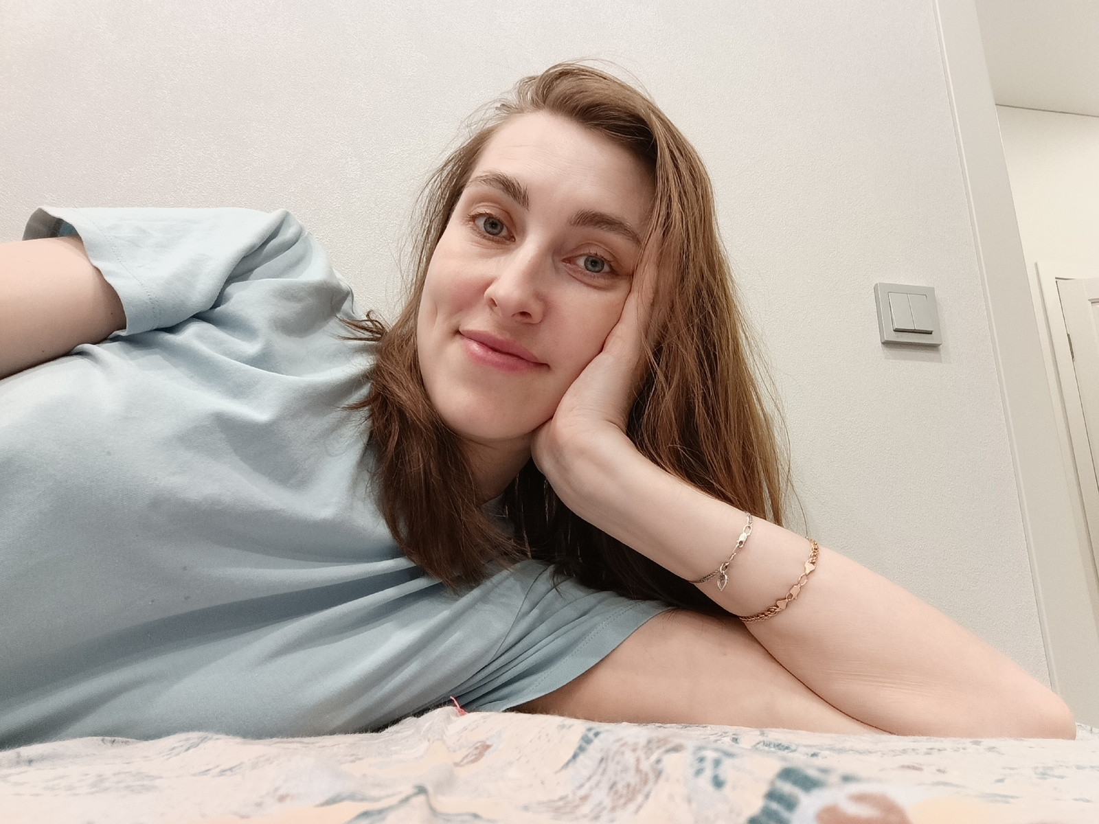 A woman is lying on a bed in what appears to be an indoor setting. The woman has light skin, blue eyes, and light brown hair. She is wearing a light blue t-shirt and two bracelets on her right wrist.…read more