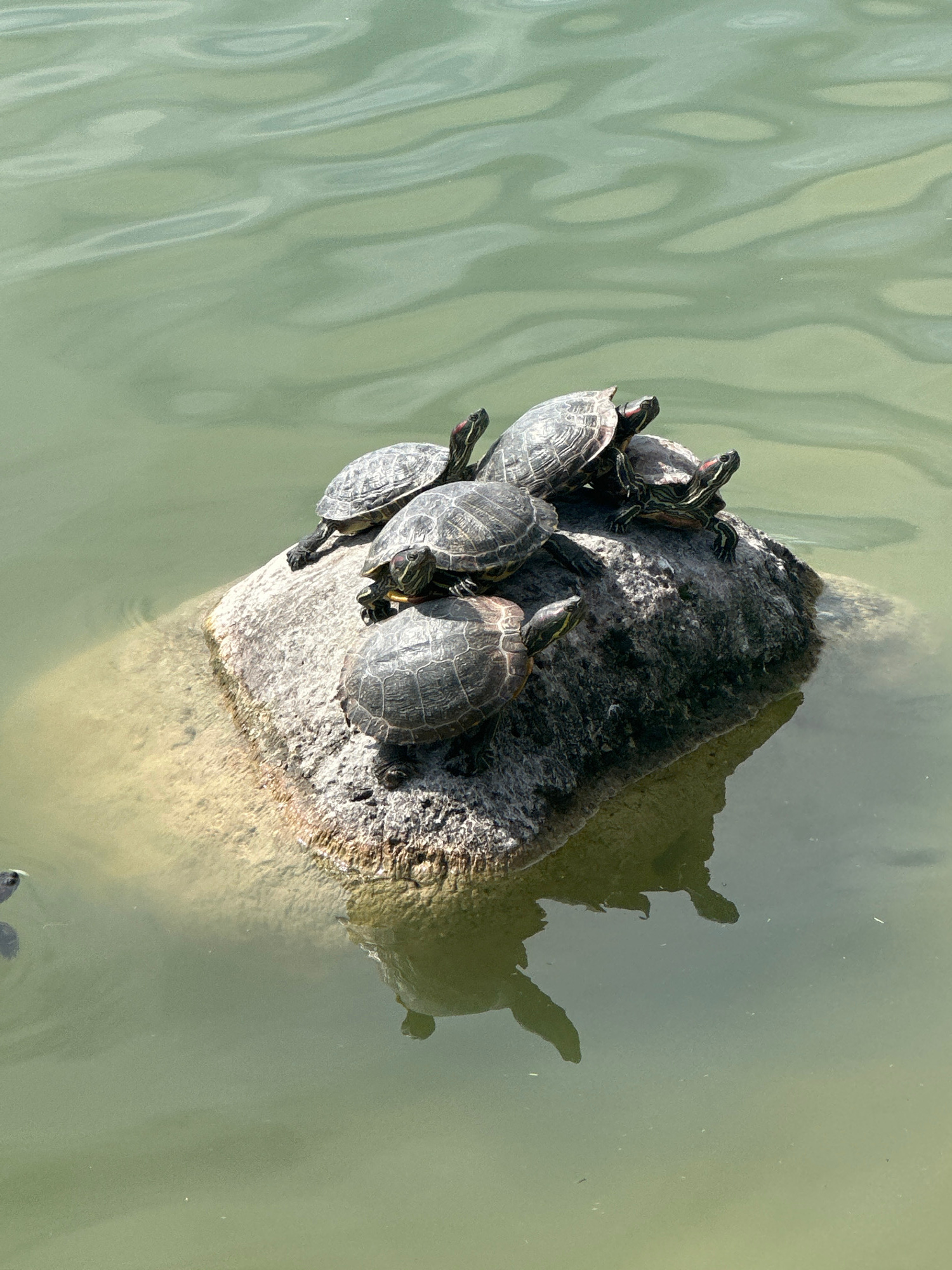 The image displays an outdoor scene within the city of Başakşehir, Turkey, depicting six Red-eared slider turtles (Trachemys scripta elegans) aggregated on a partially submerged rock in a body of wate…read more