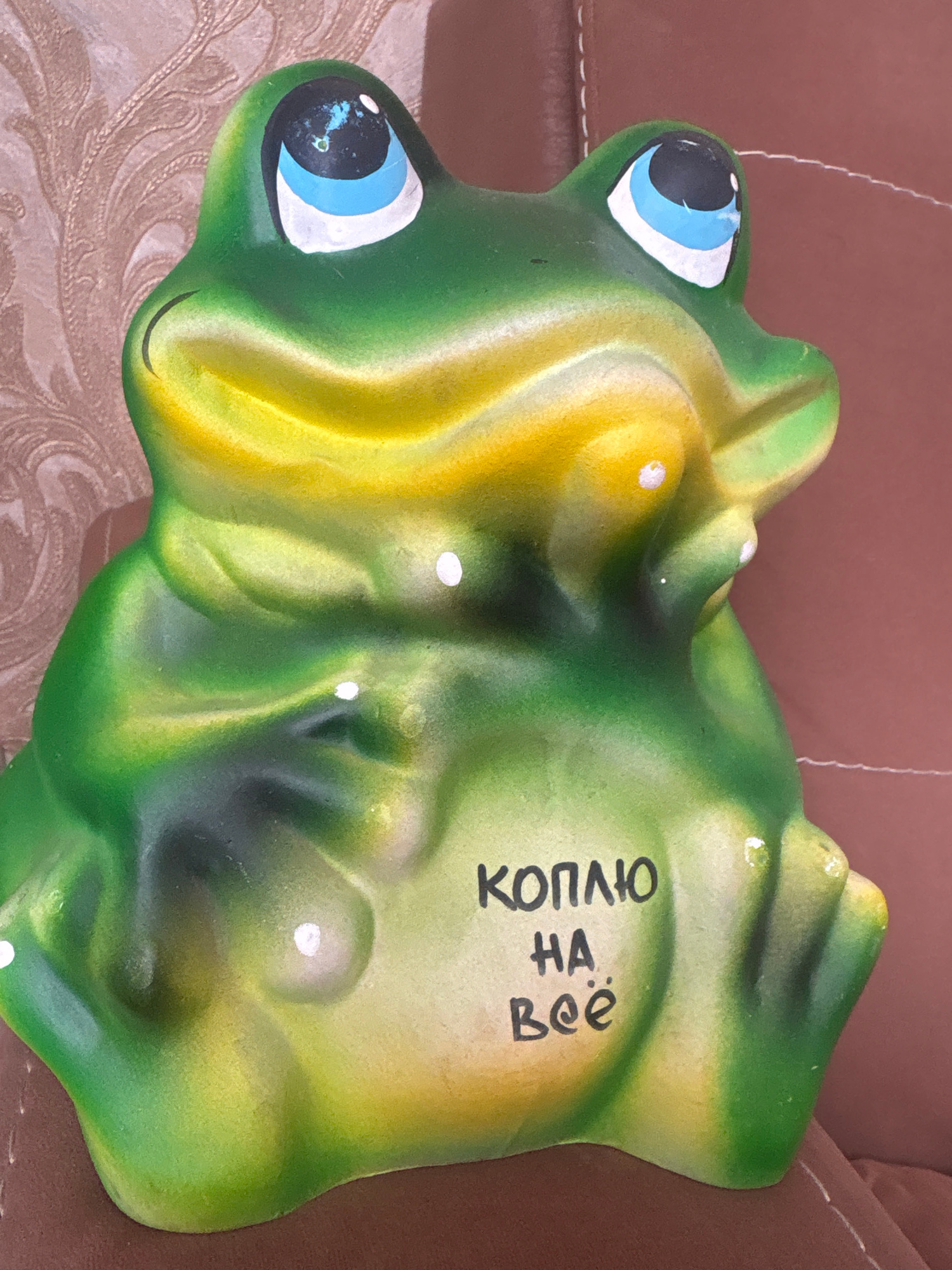 The image displays a green and yellow frog-shaped figurine, likely a piggy bank, resting on a brown upholstered surface. The frog is positioned with its head towards the upper left. Its body features…read more