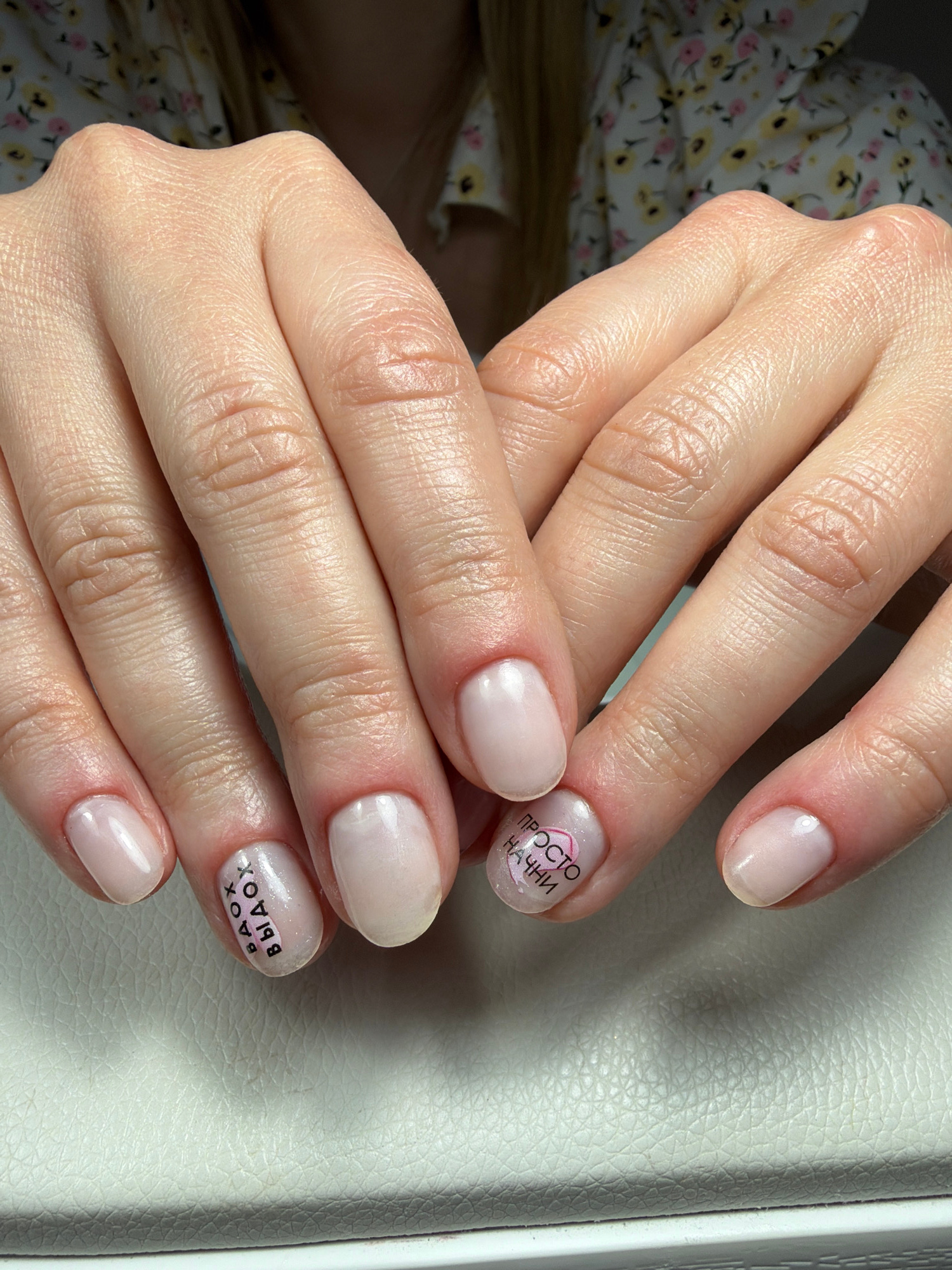 The image shows two human hands with manicured nails. The nails are painted in a light, pearlescent color. On one nail, the text "просто начни" is visible in Russian. On another nail, the text "ваох в…read more