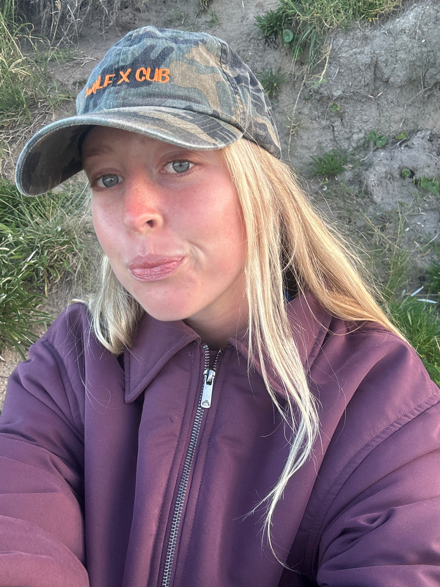 A blonde-haired individual wearing a camouflage baseball cap with orange lettering "FLEX CUB" and a purple jacket is positioned outdoors on a grassy area with patches of dirt. The location is unidenti…read more